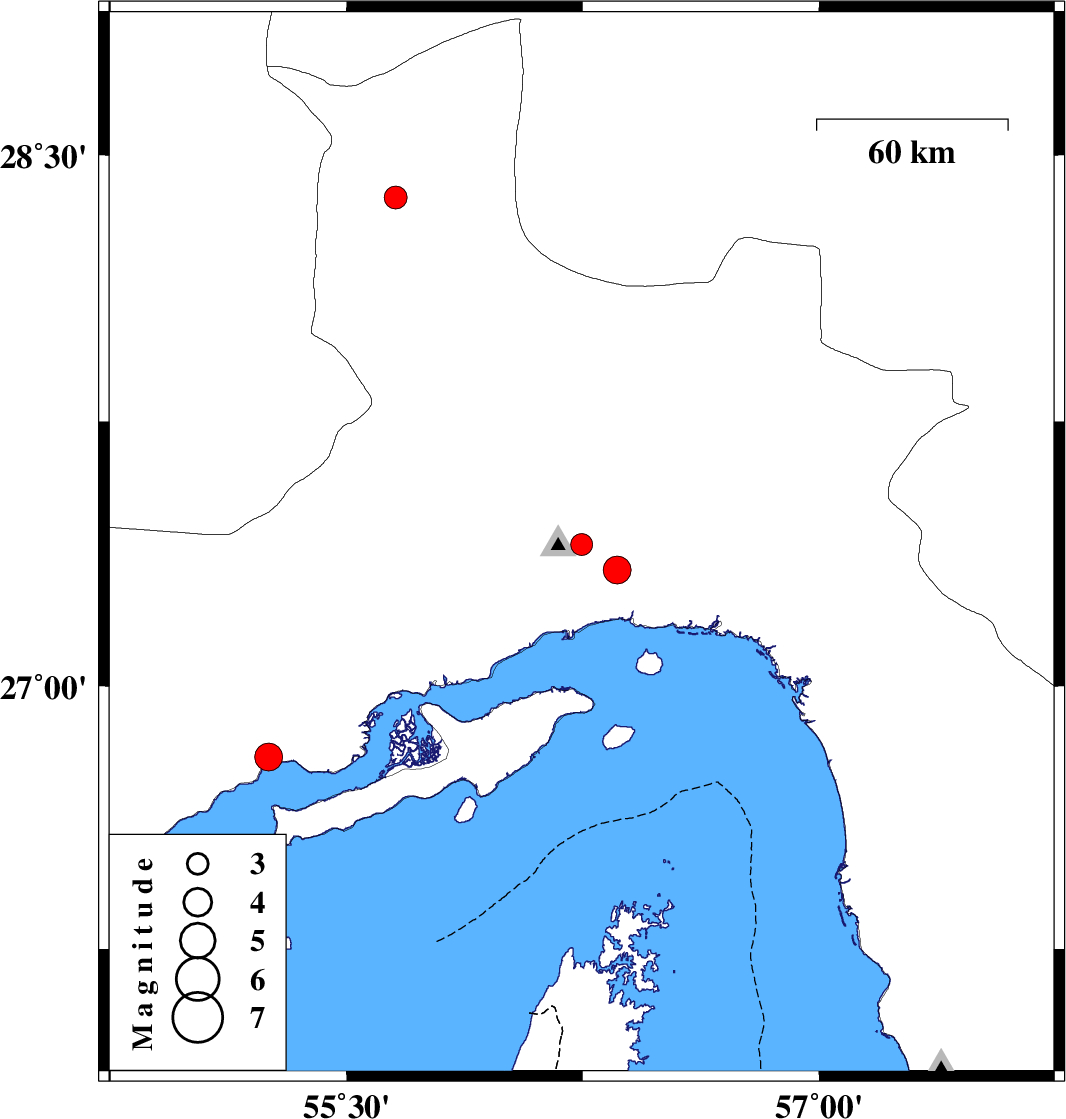 | 2023/01/01 | 14:36:23.1 | 18:06:23.1 | 27.33 | 56.359 | 12 | ML:4 | Hormozgan Province, 18 km North of Bandar-e abbas |