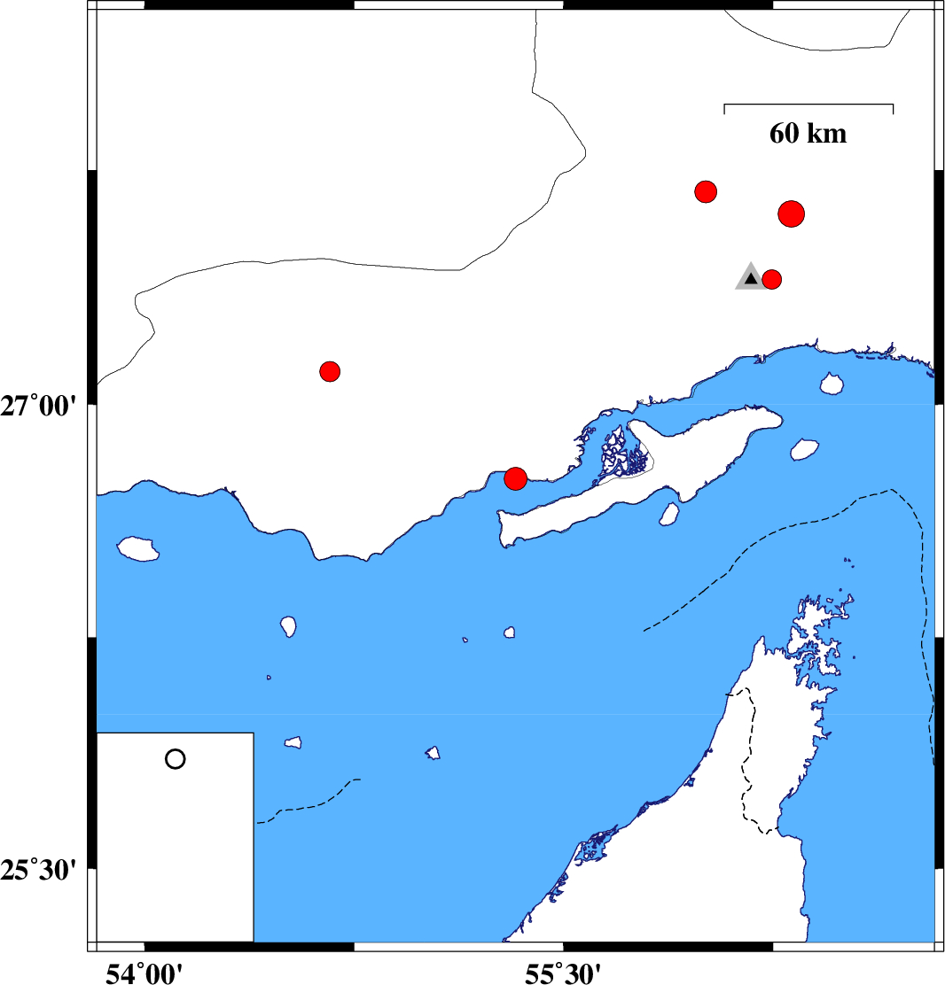 | 2023/01/12 | 08:44:30.9 | 12:14:30.9 | 26.761 | 55.328 | 10 | ML:3.6 | Persian Gulf, 54 km North-East of Bandar-e lengeh | ||