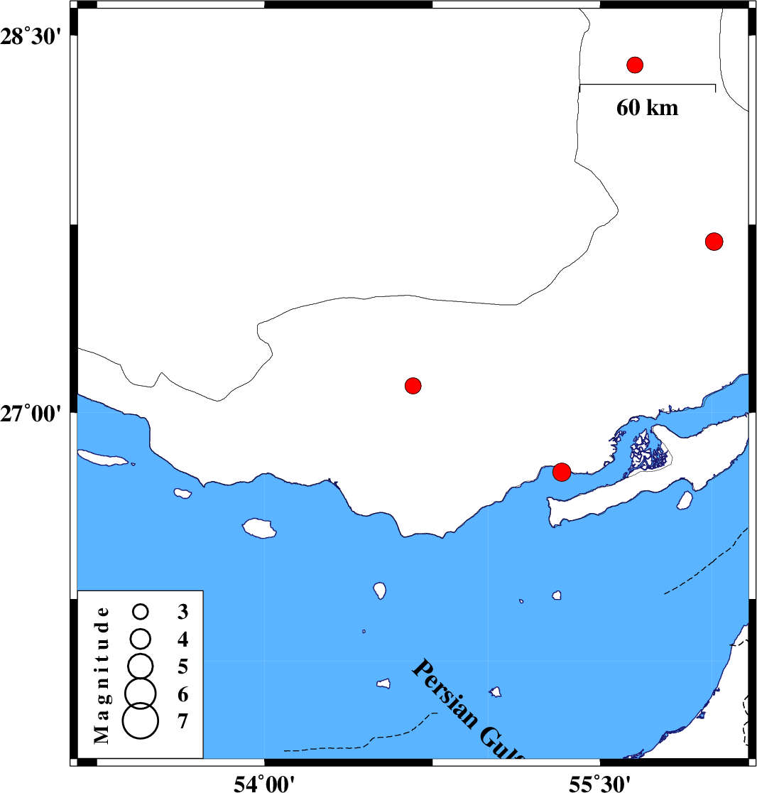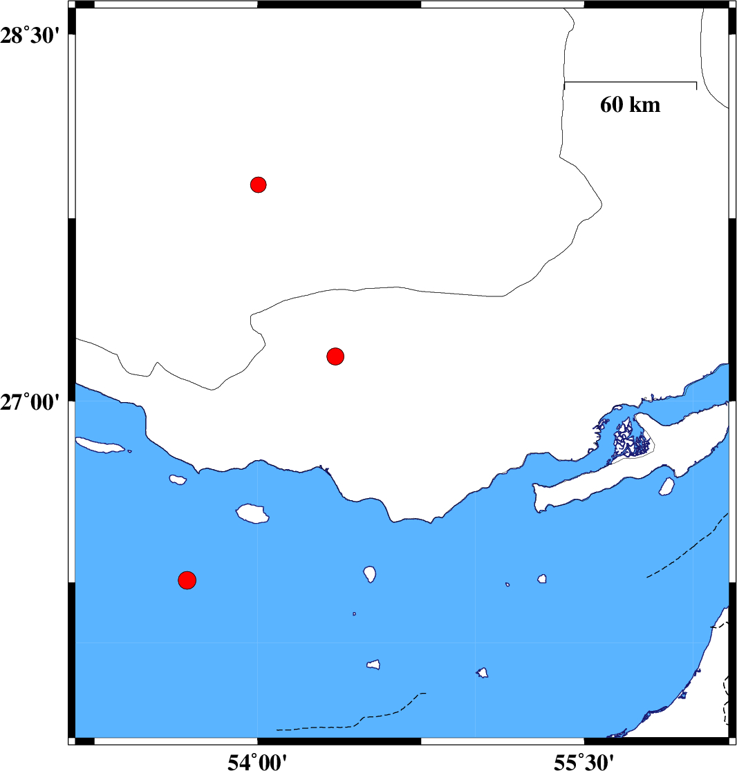 | 2023/01/12 | 08:44:30.9 | 12:14:30.9 | 26.761 | 55.328 | 10 | ML:3.6 | Persian Gulf, 54 km North-East of Bandar-e lengeh | ||