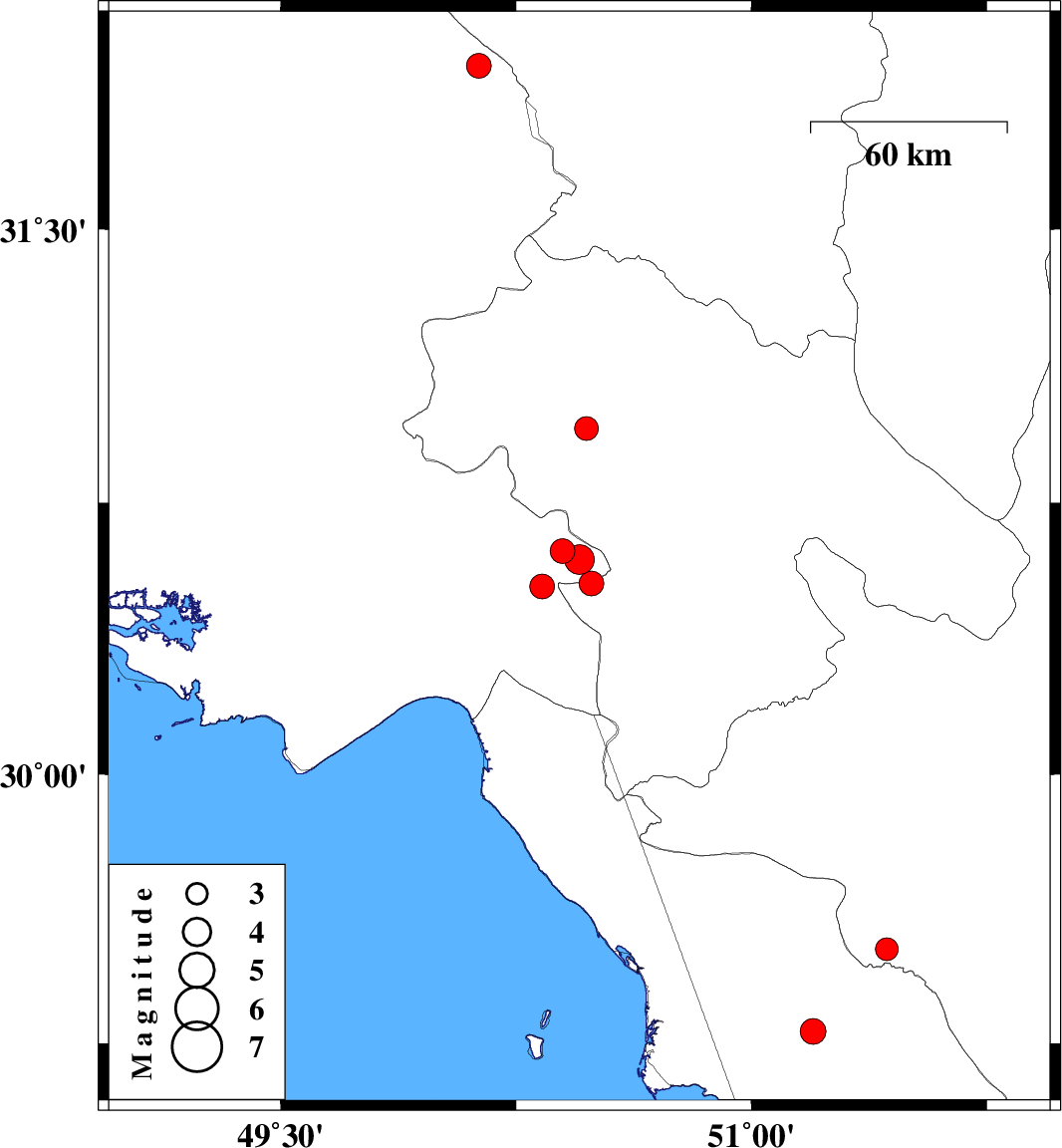 | 2023/01/27 | 06:19:30.8 | 09:49:30.8 | 29.284 | 51.197 | 16 | ML:3.6 | Bushehr Province, 3 km of Borazjan | ||