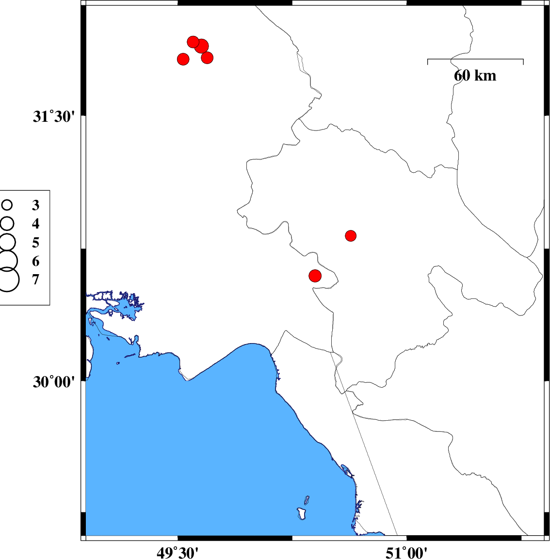 | 2023/01/27 | 09:36:39.4 | 13:06:39.4 | 30.593 | 50.452 | 16 | ML:4.3 | Khoozestan Province, 20 km -East of Behbahan | ||