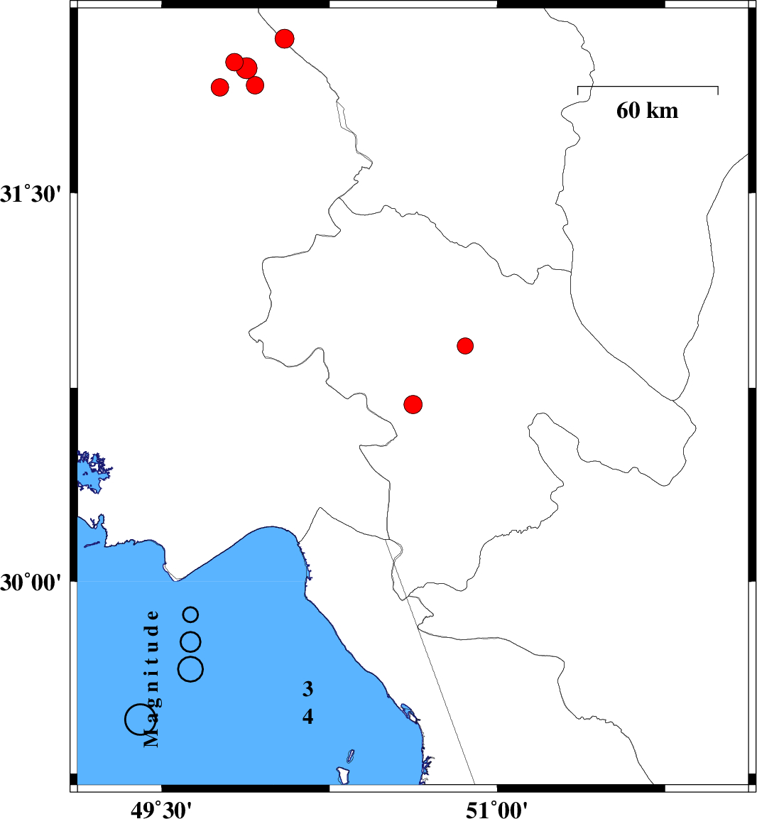 | 2023/01/27 | 09:36:39.4 | 13:06:39.4 | 30.593 | 50.452 | 16 | ML:4.3 | Khoozestan Province, 20 km -East of Behbahan | ||