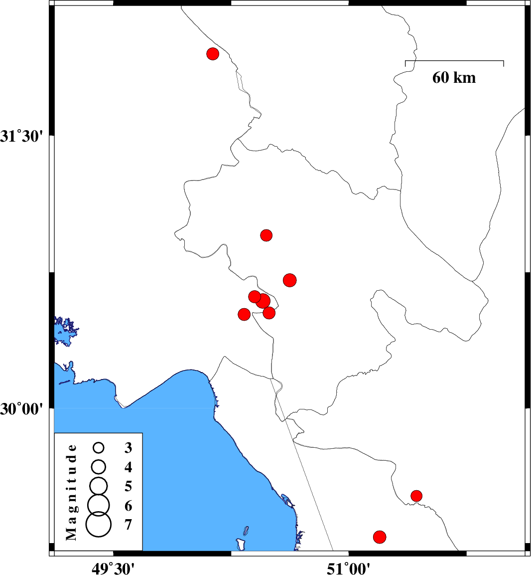 | 2023/01/27 | 06:19:30.8 | 09:49:30.8 | 29.284 | 51.197 | 16 | ML:3.6 | Bushehr Province, 3 km of Borazjan | ||