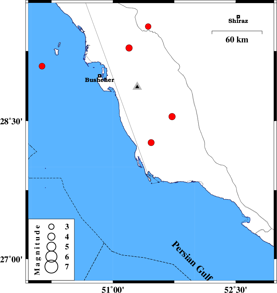 | 2023/01/04 | 15:22:28.9 | 18:52:28.9 | 29.089 | 50.134 | 12 | ML:3.4 | Persian Gulf, 69 km North-West of Busheher |