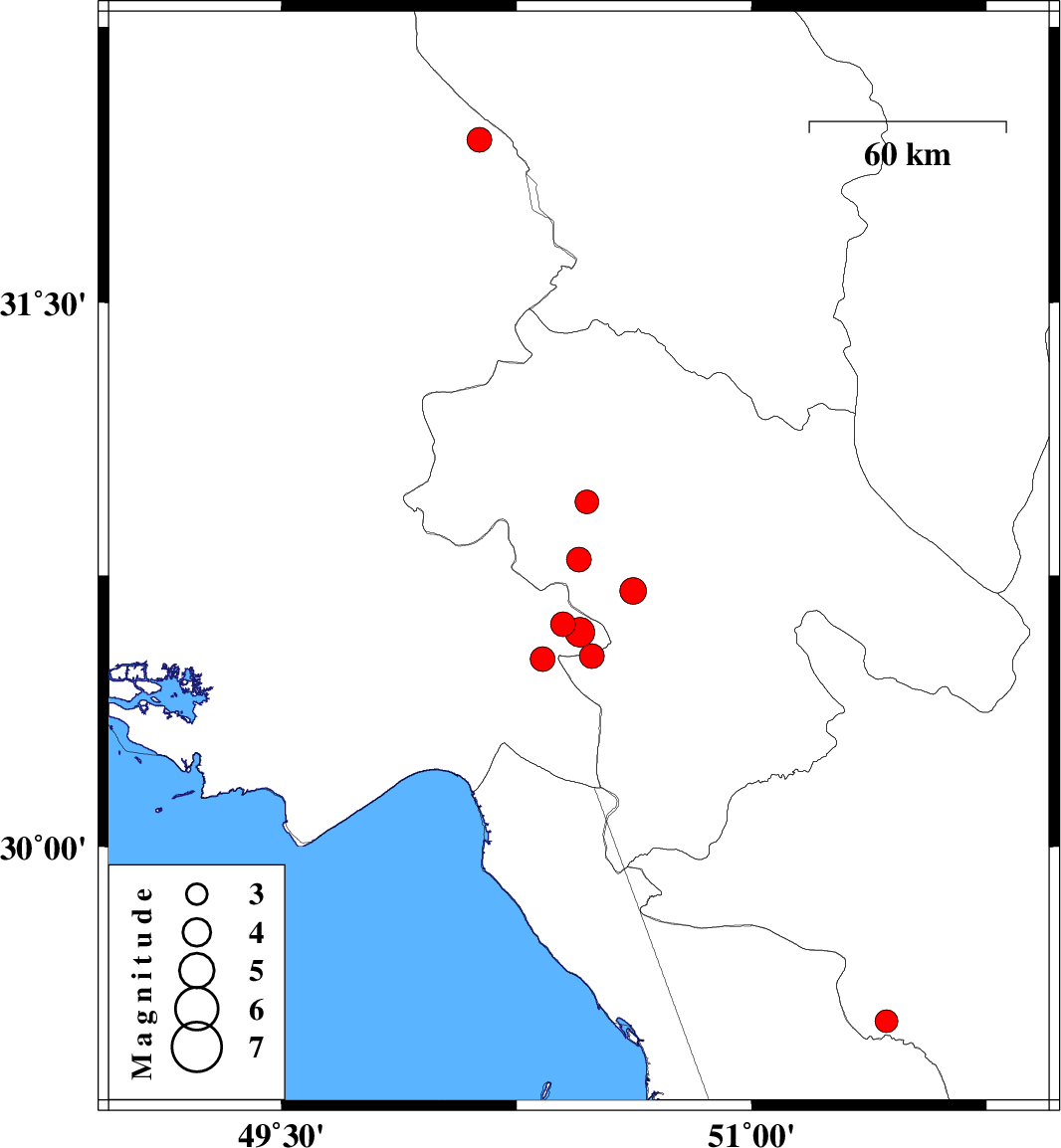 | 2023/01/27 | 09:36:39.4 | 13:06:39.4 | 30.593 | 50.452 | 16 | ML:4.3 | Khoozestan Province, 20 km -East of Behbahan | ||