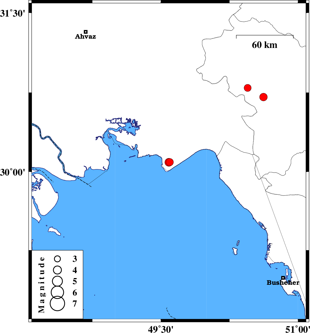 | 2023/02/04 | 16:00:51.4 | 19:30:51.4 | 30.09 | 49.587 | 12 | ML:3.9 | Khoozestan Province, 20 km South-West of Hendijan | ||