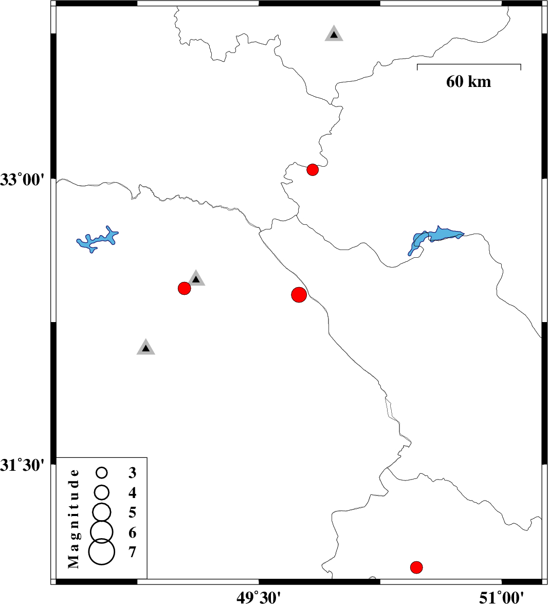 | 2023/01/30 | 17:40:26.6 | 21:10:26.6 | 33.045 | 49.833 | 10 | ML:3.3 | Esfahan Province, 28 km North-West of Fereydunshahr | ||