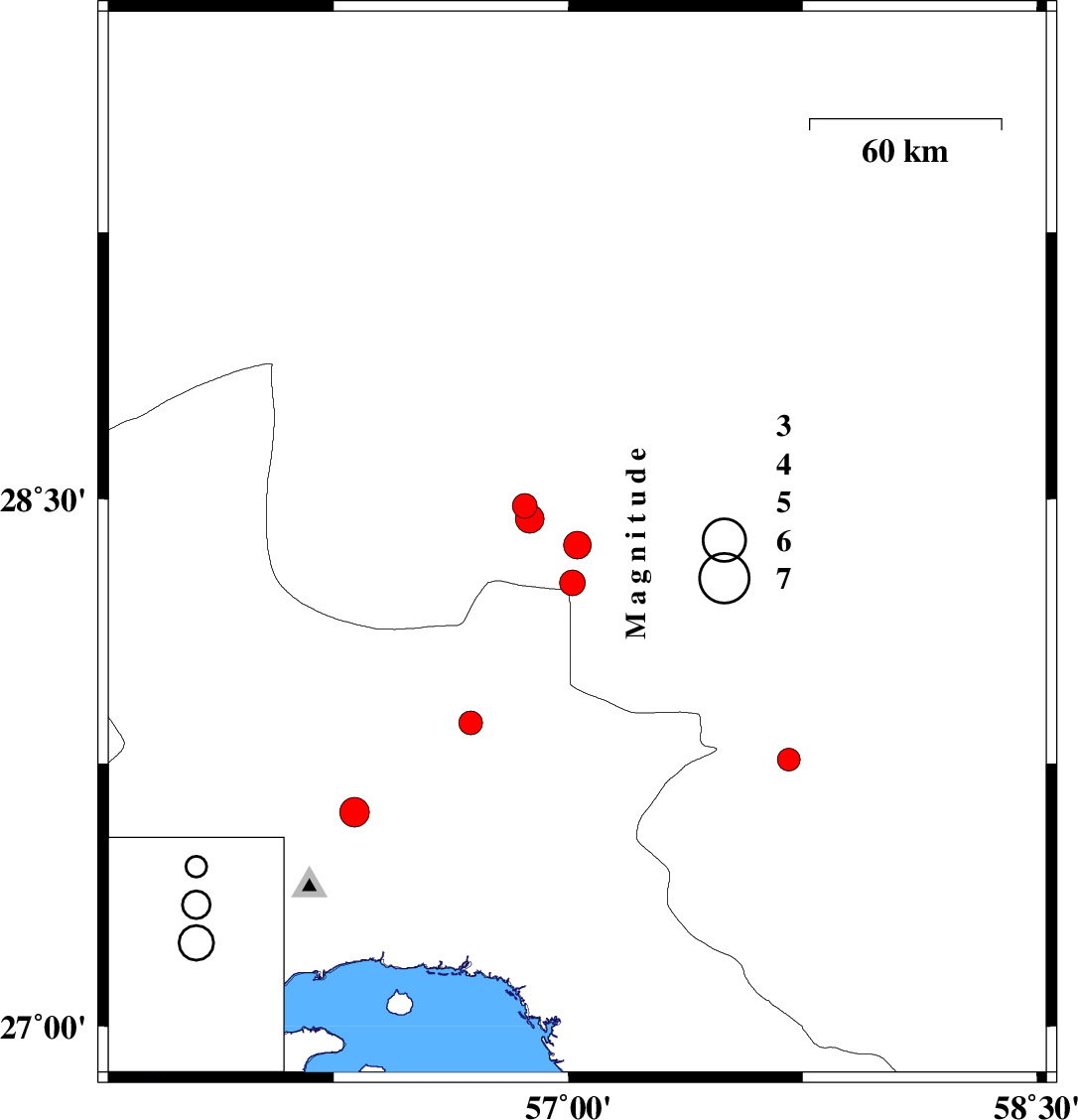 2023/02/09 | 09:19:23.9 | 12:49:23.9 | 28.262 | 57.013 | 12 | ML:3.6 | Kerman Province, 75 km North-West of Kahnuj | ||