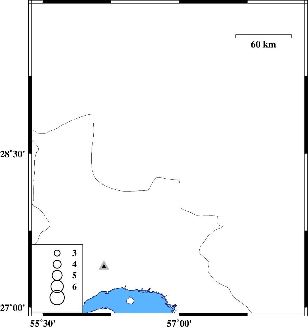 | 2023/02/08 | 23:25:21.9 | 02:55:21.9 | 28.444 | 56.876 | 12 | ML:4.1 | Kerman Province, 92 km South-East of Baft |