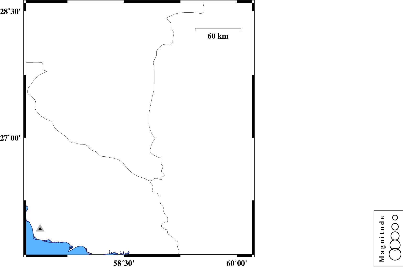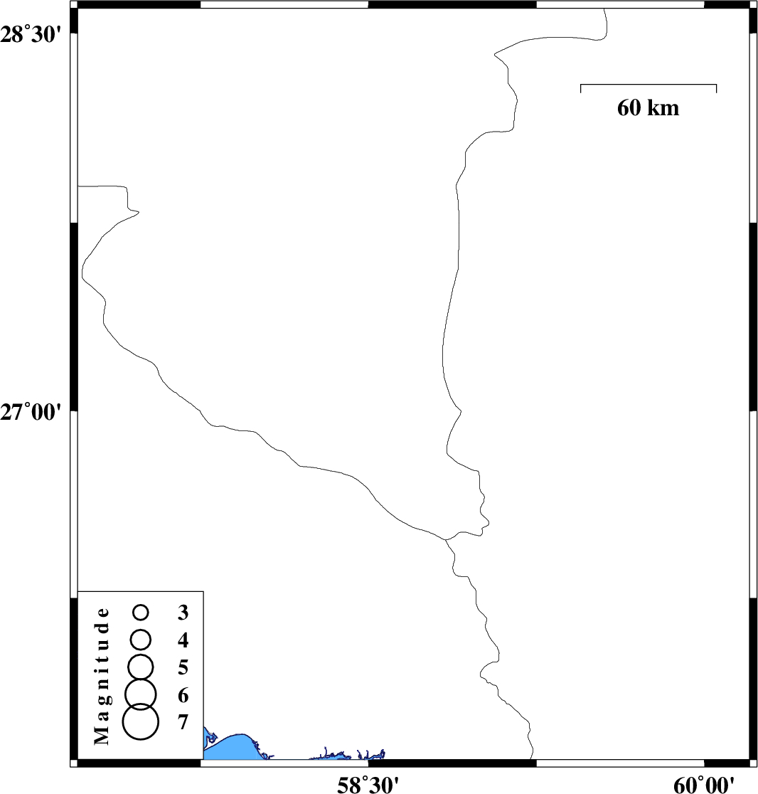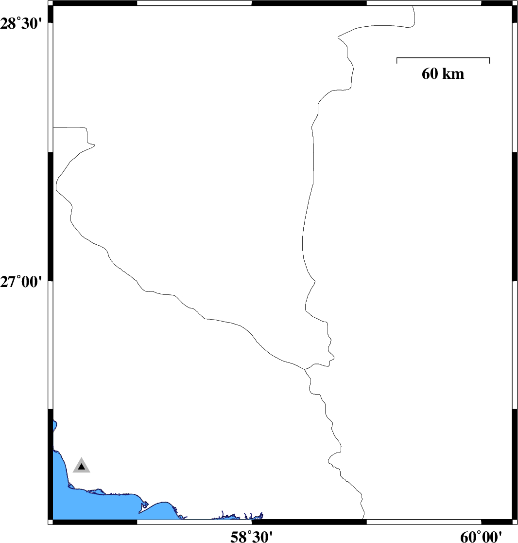 | 2023/02/19 | 00:39:41.1 | 04:09:41.1 | 27.098 | 58.701 | 12 | ML:3.5 | Kerman Province, 124 km South-East of Manujan |