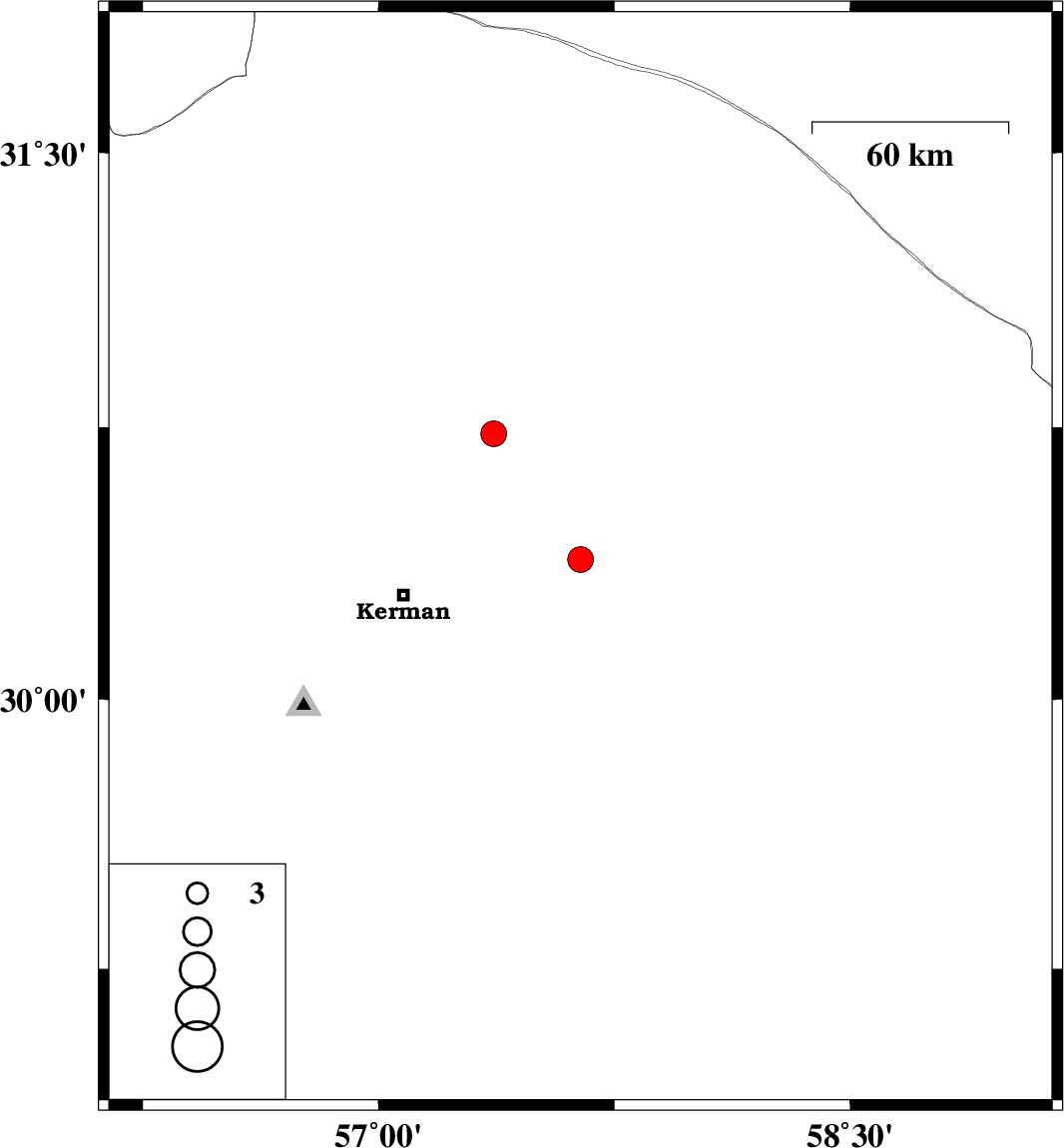 2023/02/09 | 00:52:34.5 | 04:22:34.5 | 30.732 | 57.366 | 12 | ML:3.6 | Kerman Province, 57 km North-East of Kerman |