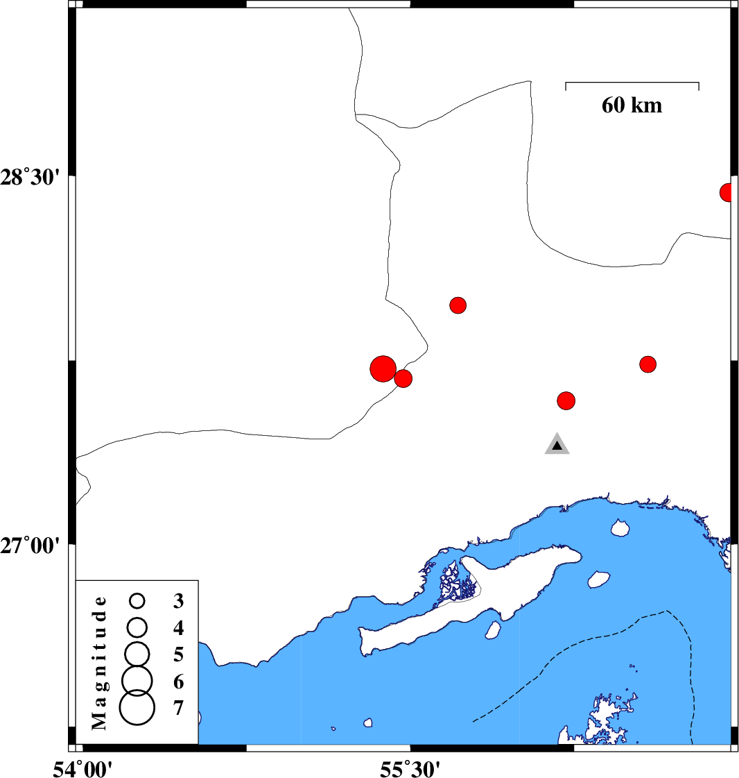 | 2023/02/20 | 07:39:19.6 | 11:09:19.6 | 27.586 | 56.214 | 10 | ML:3.7 | Hormozgan Province, 45 km North of Bandar-e abbas | ||