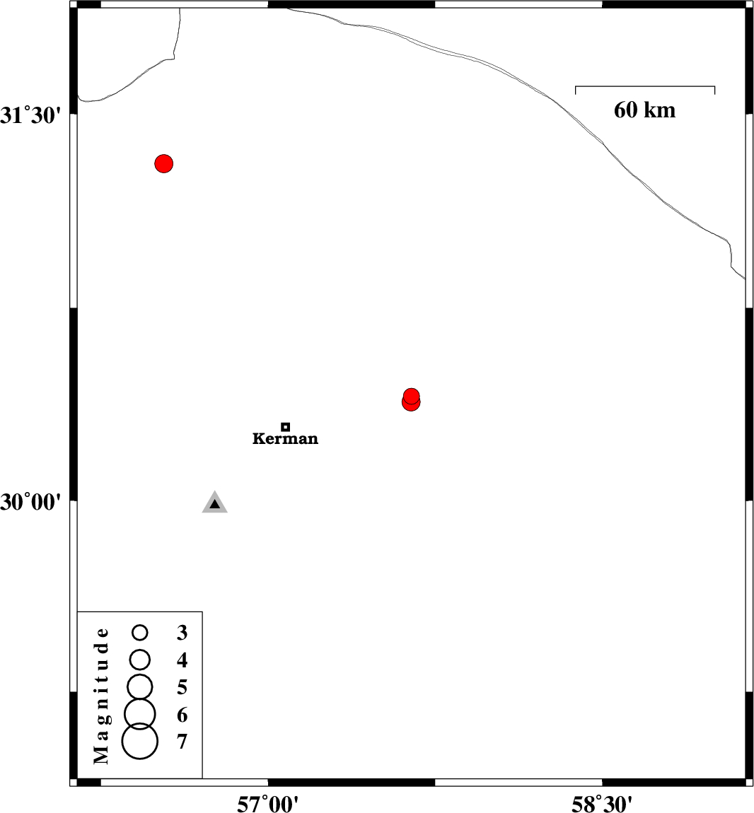 | 2023/02/23 | 10:54:02.5 | 14:24:02.5 | 30.407 | 57.643 | 12 | ML:3.2 | Kerman Province, 56 km North-East of Kerman | ||