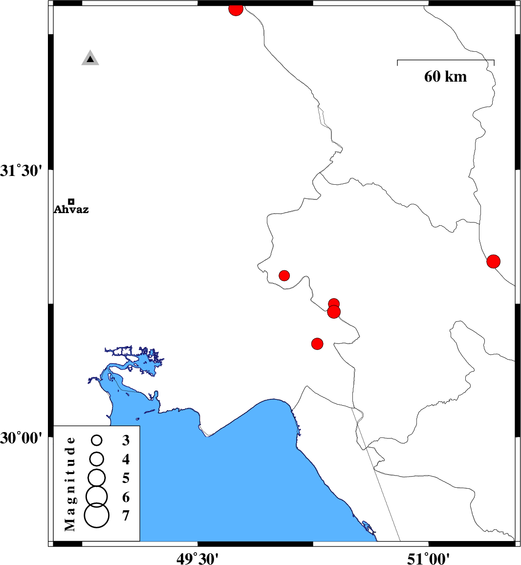 | 2023/03/07 | 00:57:50.6 | 04:27:50.6 | 30.908 | 50.062 | 12 | ML:3.1 | Kohkiluieh va boyerahmad Province, 39 km North-West of Behbahan | ||