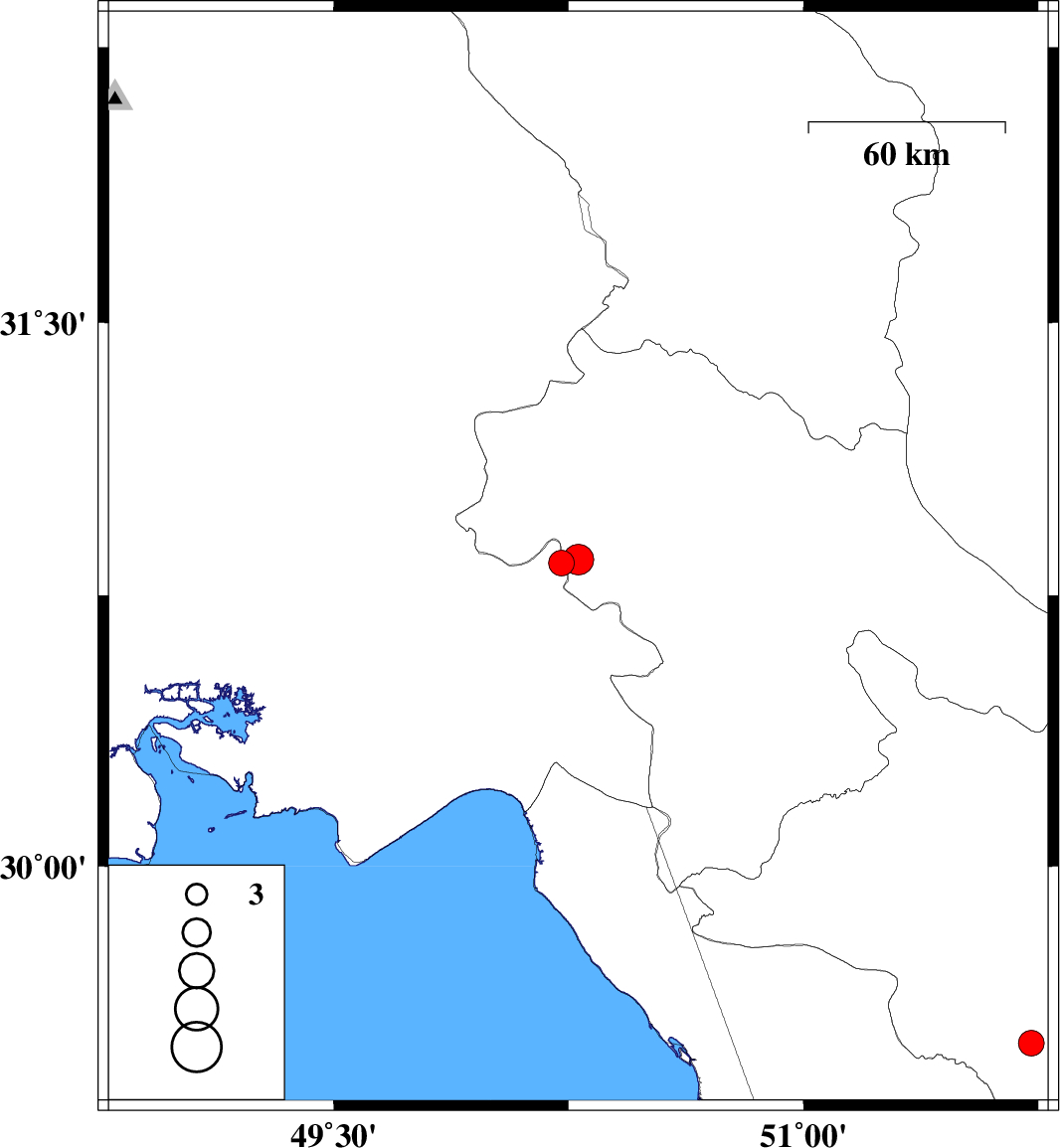 | 2023/03/16 | 21:51:32.9 | 01:21:32.9 | 30.839 | 50.227 | 12 | ML:3.6 | Khoozestan Province, 27 km North of Behbahan | ||
