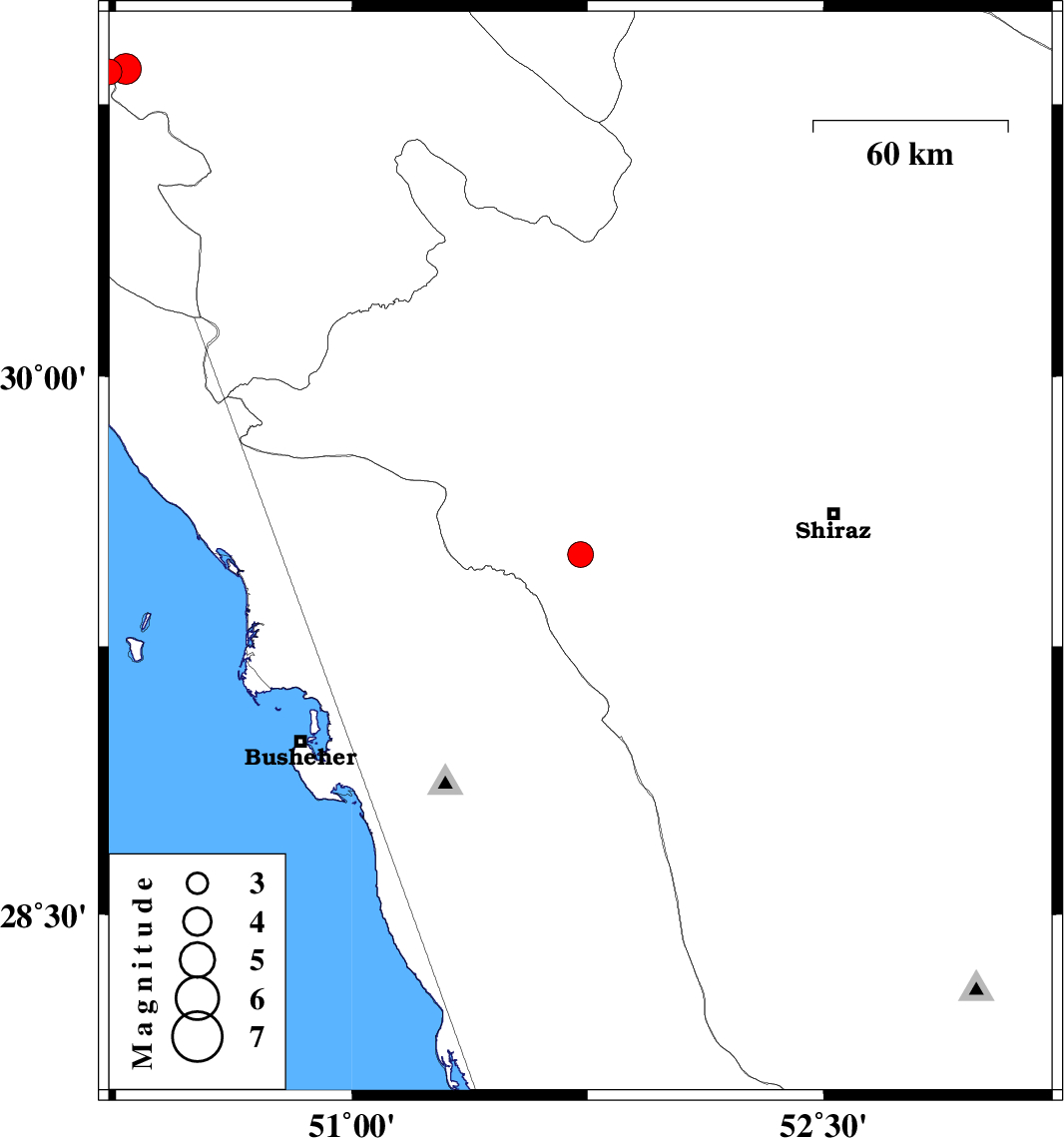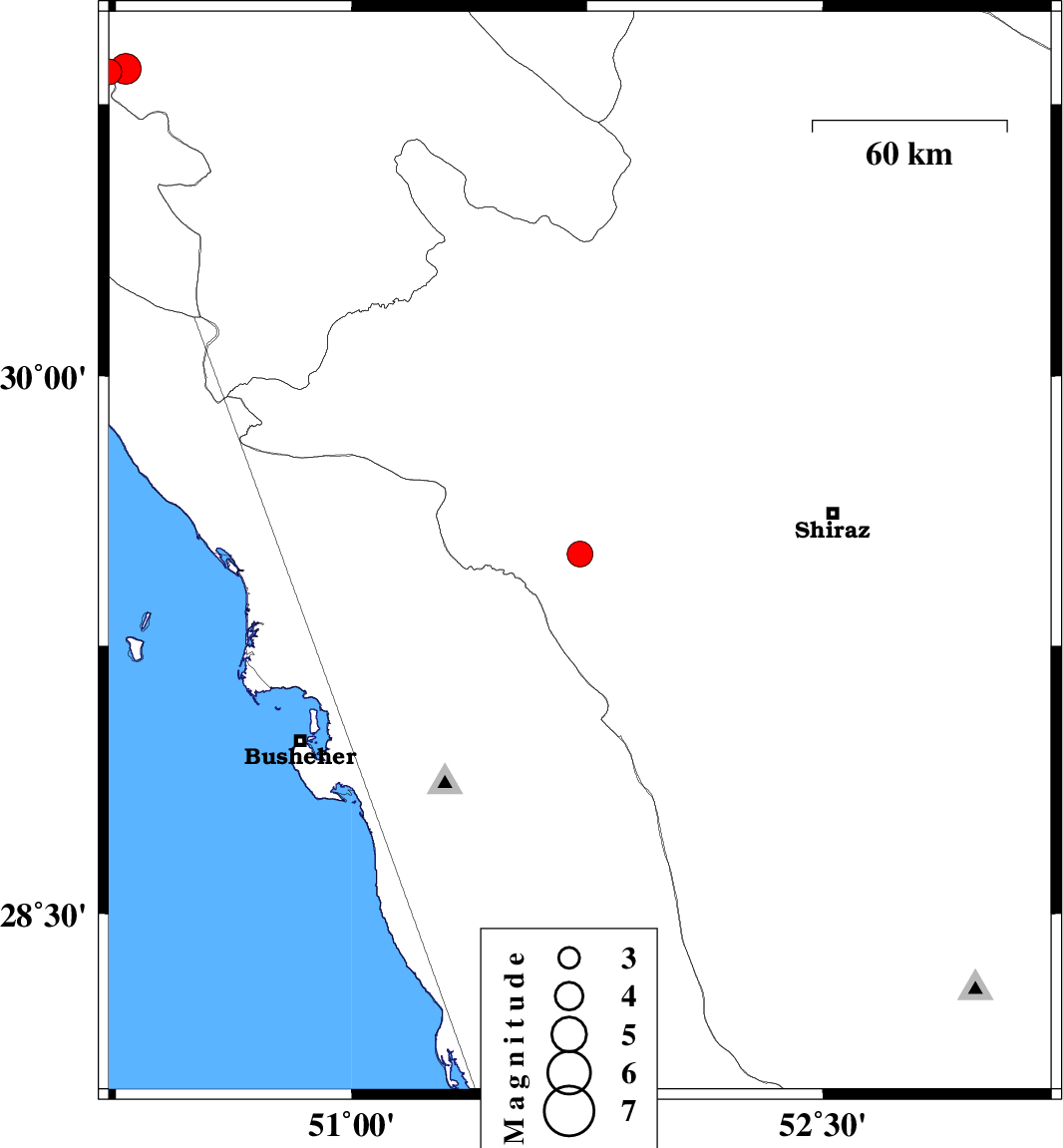 | 2023/03/16 | 22:03:18.8 | 01:33:18.8 | 29.506 | 51.727 | 12 | ML:3.6 | Fars Province, 15 km South of Kazerun | ||