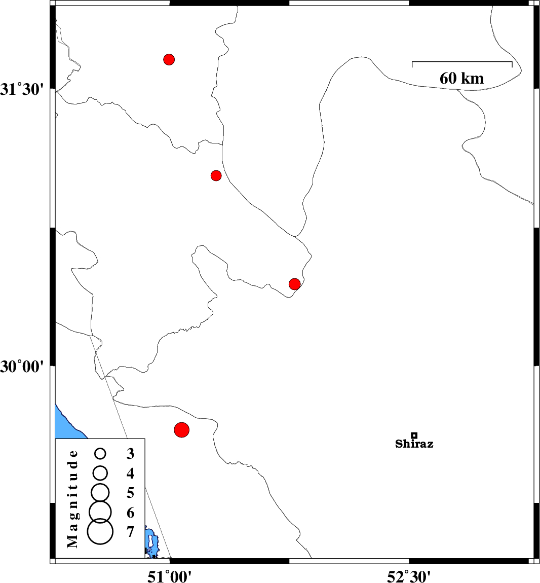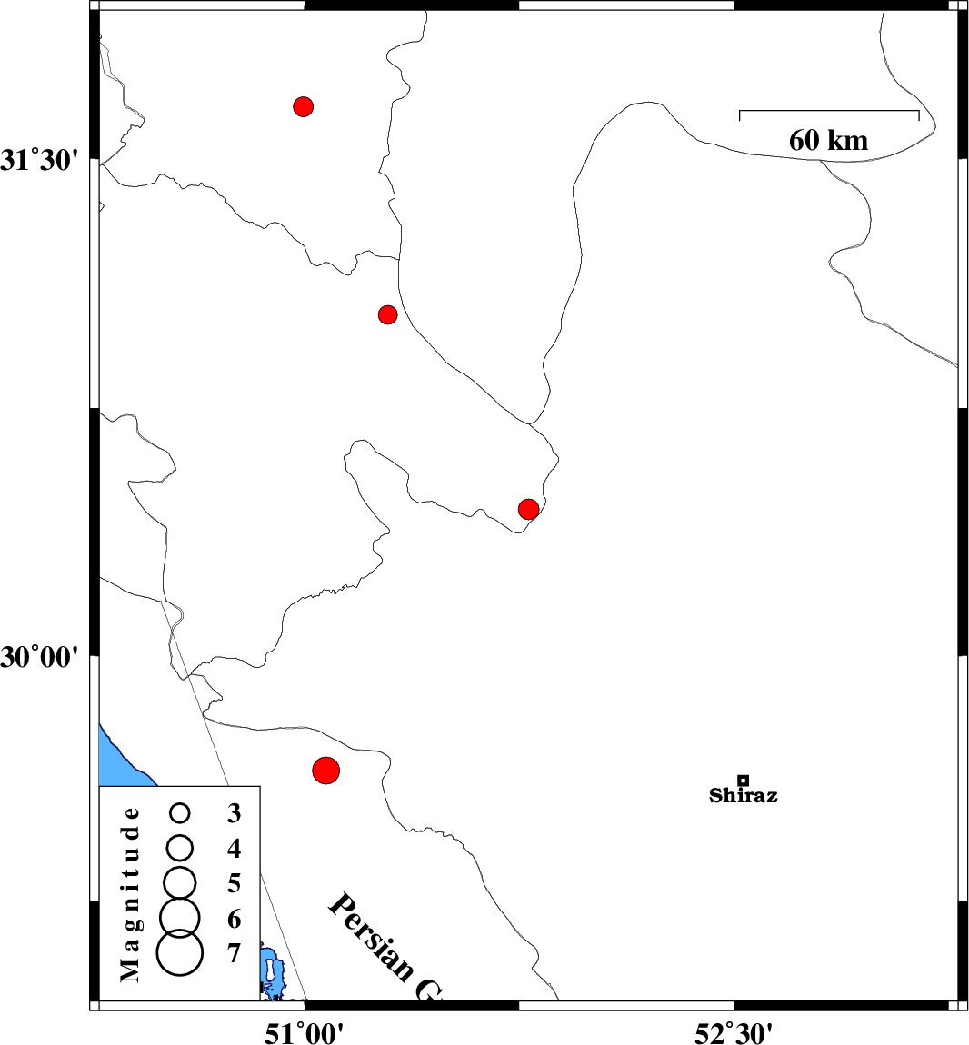 | 2023/03/19 | 08:28:43.4 | 11:58:43.4 | 29.65 | 51.075 | 10 | ML:4.3 | Bushehr Province, 45 km North-West of Borazjan |