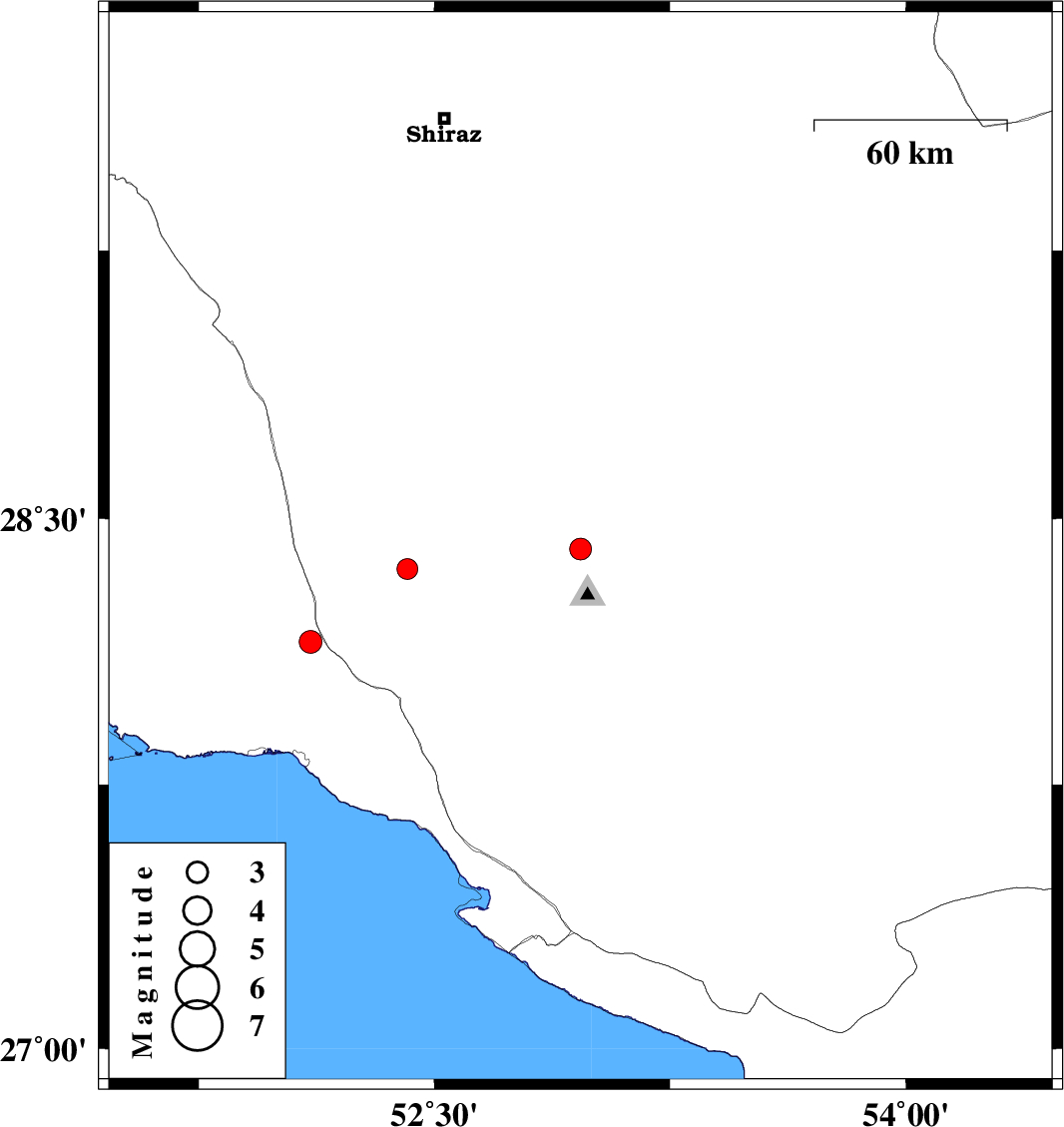 | 2023/03/28 | 01:45:11.6 | 05:15:11.6 | 28.359 | 52.414 | 12 | ML:3 | Fars Province, 59 km North of Jam | ||