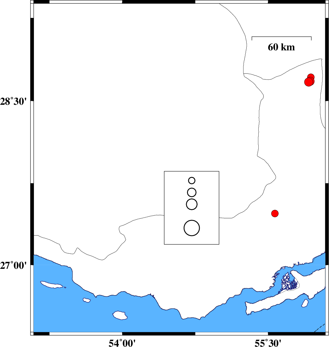 | 2023/03/25 | 01:50:57.9 | 05:20:57.9 | 27.917 | 54.595 | 9 | ML:3.3 | Fars Province, 37 km North-East of Lar |