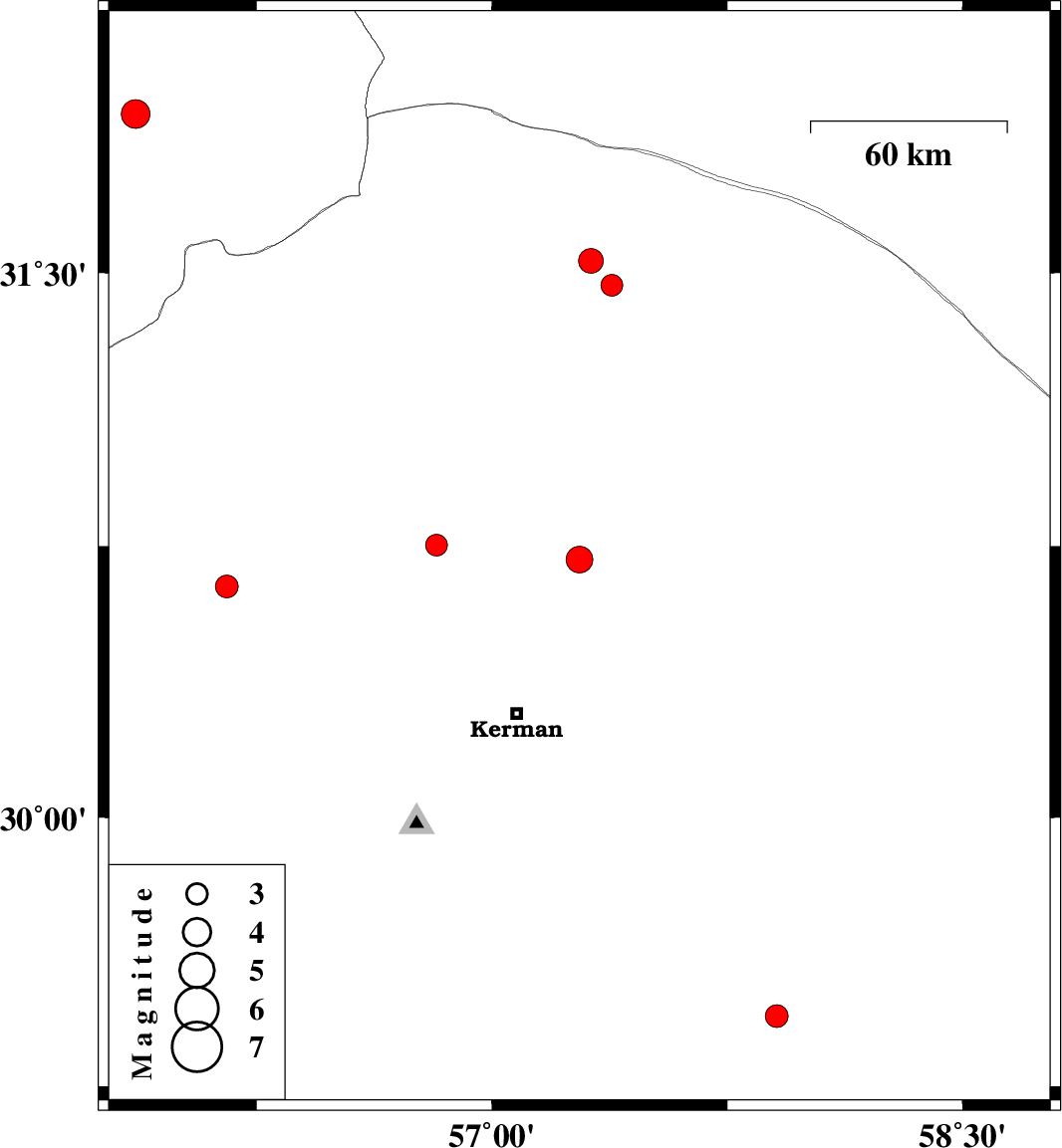| 2023/04/03 | 01:38:30.9 | 05:08:30.9 | 30.638 | 56.156 | 12 | ML:3.3 | Kerman Province, 30 km North-East of Rafsanjan | ||