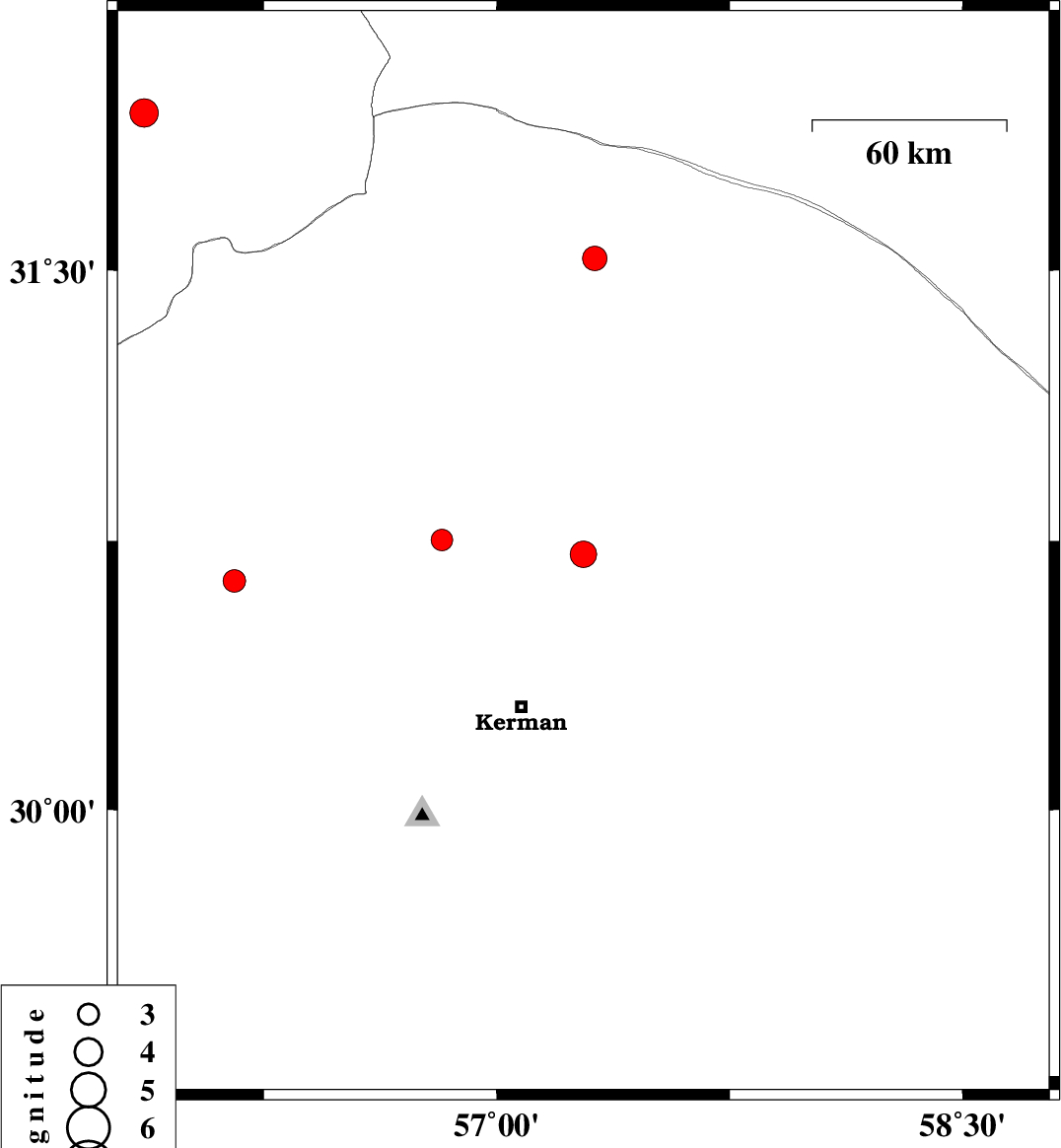 2023/04/03 | 08:52:56.5 | 12:22:56.5 | 30.713 | 57.279 | 12 | ML:3.8 | Kerman Province, 51 km North-East of Kerman | ||