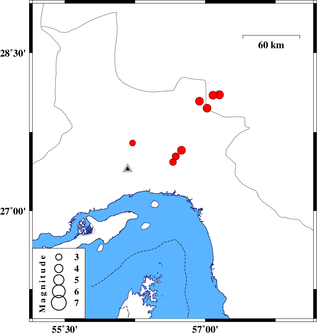 | 2023/04/03 | 03:55:05.0 | 07:25:05.0 | 28.043 | 56.938 | 12 | ML:4 | Hormozgan Province, 75 km -West of Kahnuj |