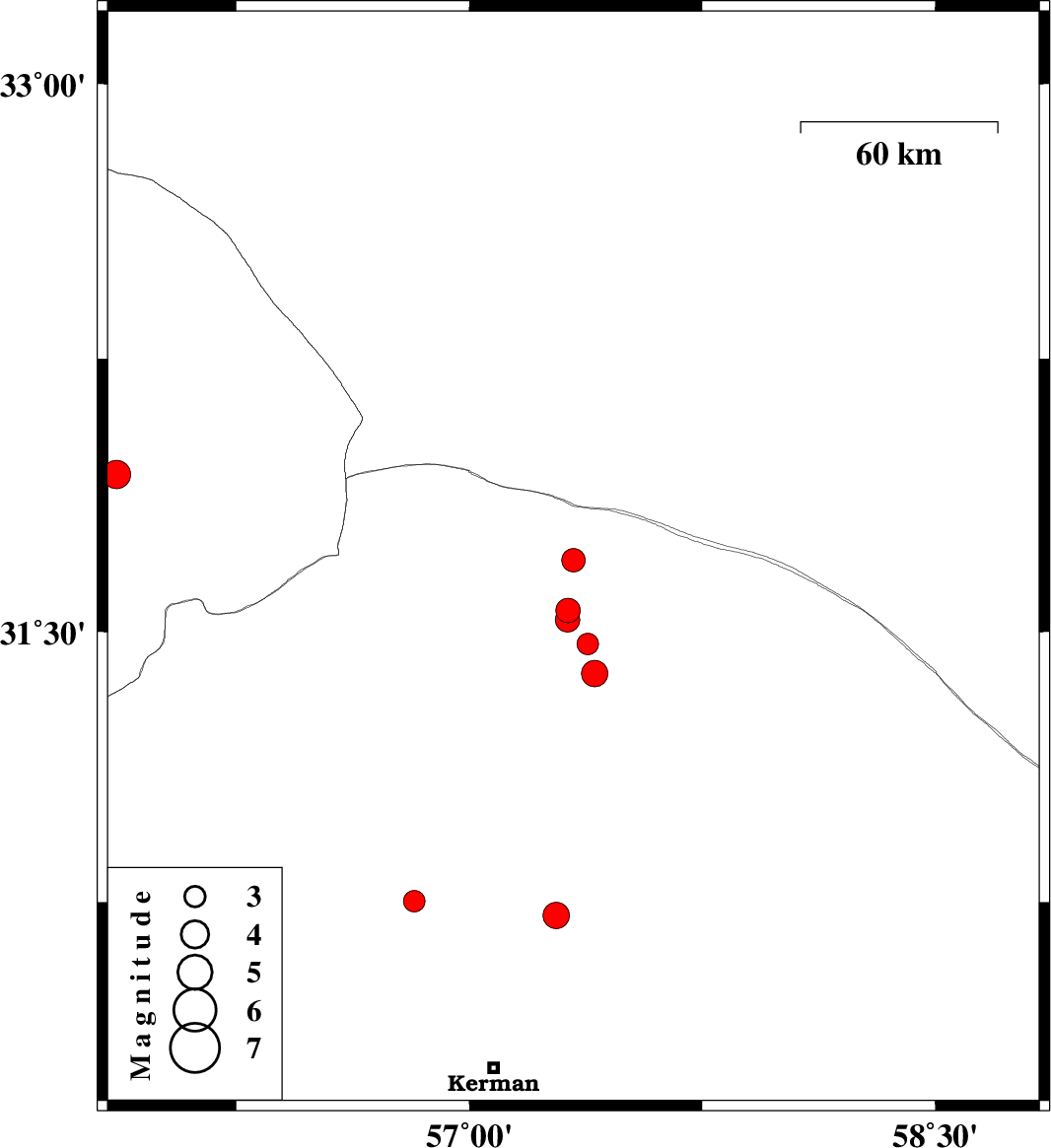 | 2023/04/03 | 01:38:30.9 | 05:08:30.9 | 30.638 | 56.156 | 12 | ML:3.3 | Kerman Province, 30 km North-East of Rafsanjan | ||