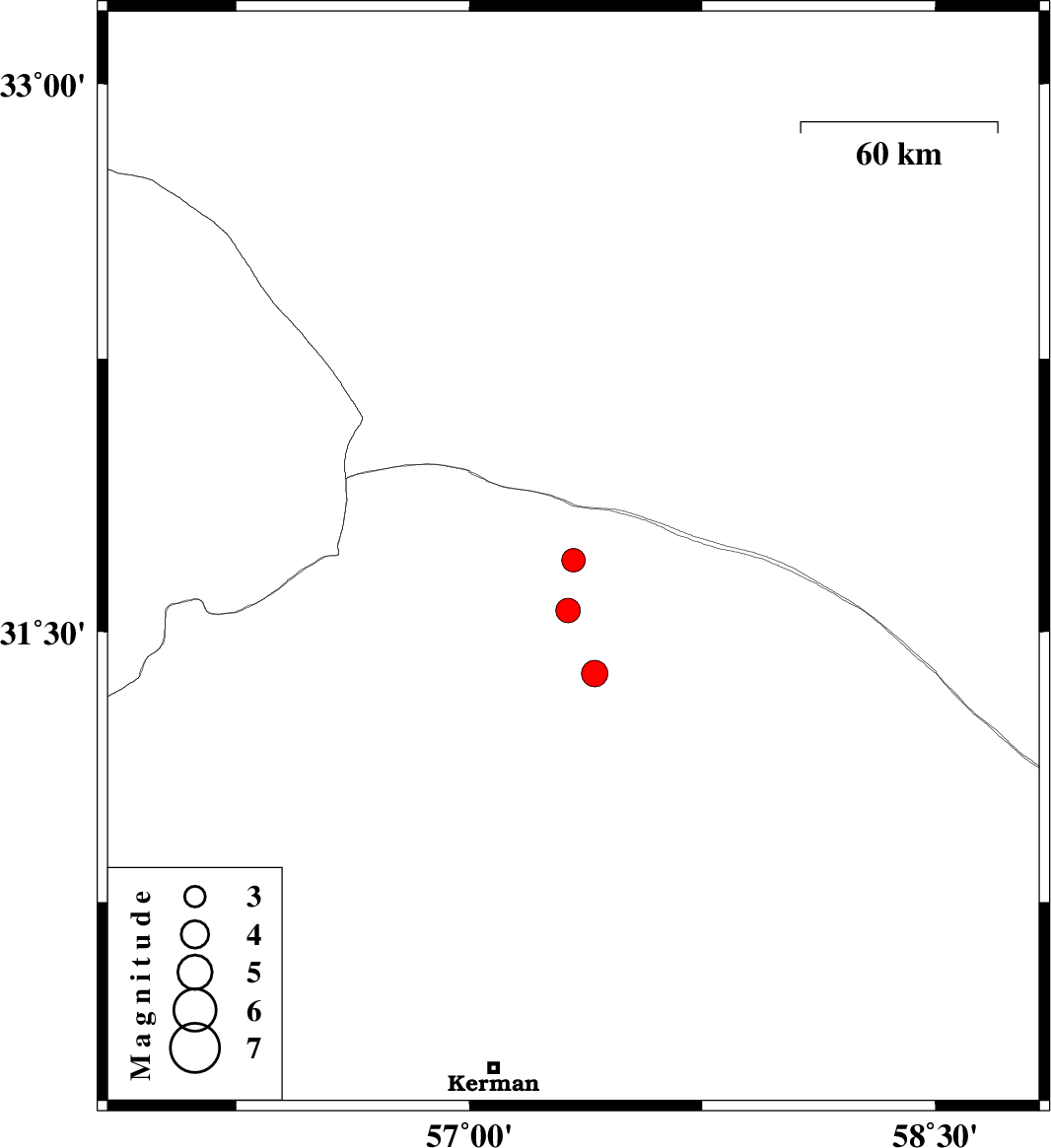 | 2023/04/06 | 01:05:20.2 | 04:35:20.2 | 31.558 | 57.317 | 12 | ML:3.5 | Kerman Province, 58 km North-East of Ravar |