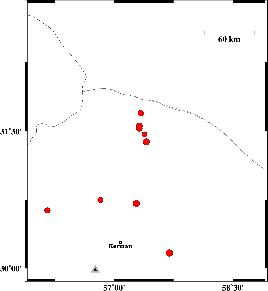 | 2023/04/08 | 11:34:29.8 | 15:04:29.8 | 30.169 | 57.696 | 10 | ML:3.9 | Kerman Province, 61 km South-East of Kerman | ||