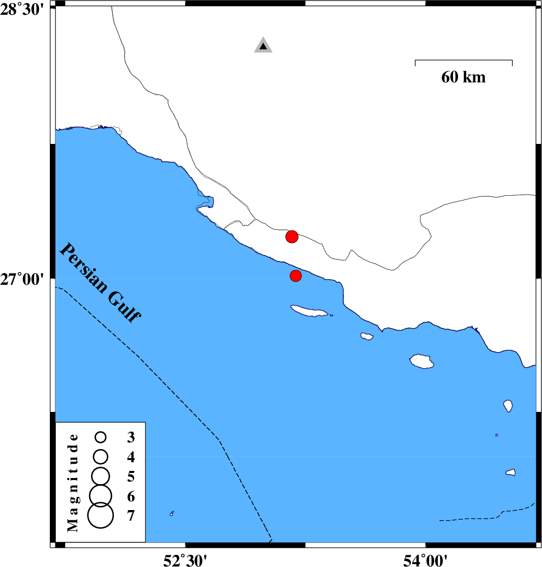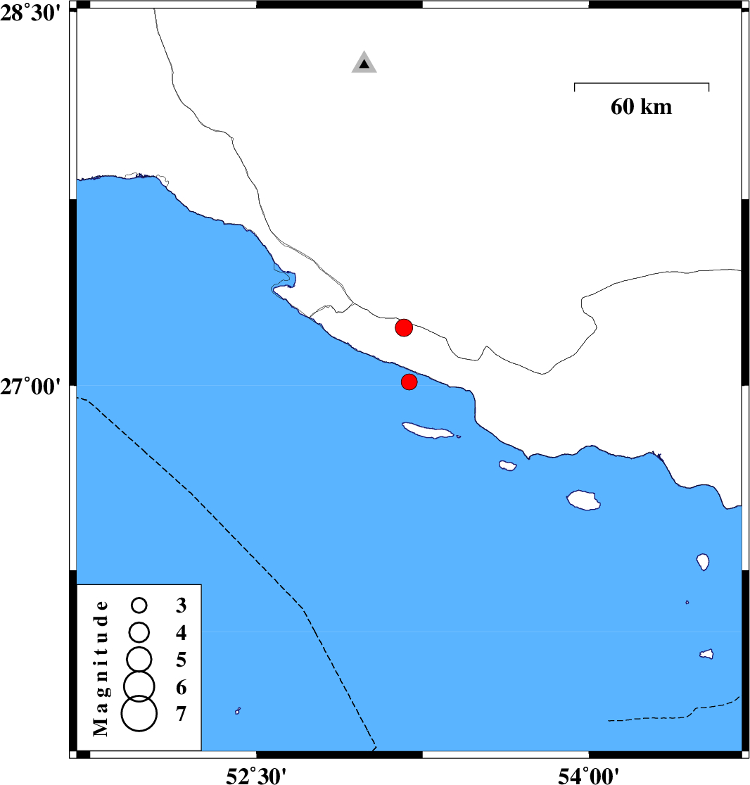 | 2023/04/11 | 21:04:06.8 | 00:34:06.8 | 27.014 | 53.189 | 12 | ML:3.3 | Persian Gulf, 36 km South of Lamerd | ||