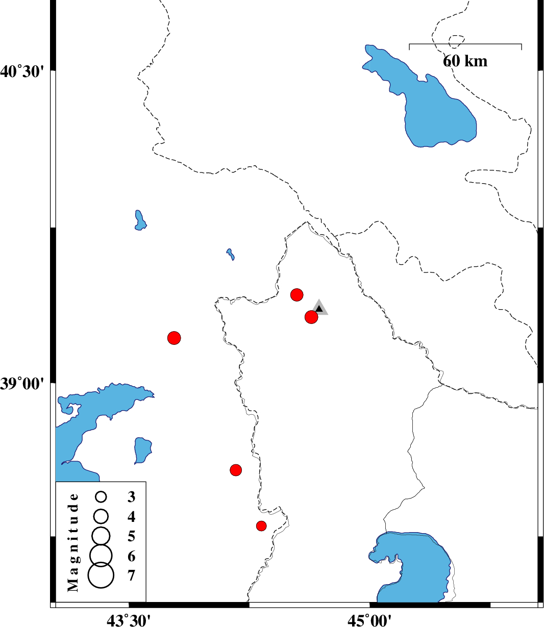 | 2023/04/17 | 04:07:18.9 | 07:37:18.9 | 39.217 | 43.781 | 12 | ML:3.7 | Turkey, 57 km North-West of Seyah Cheshmah |