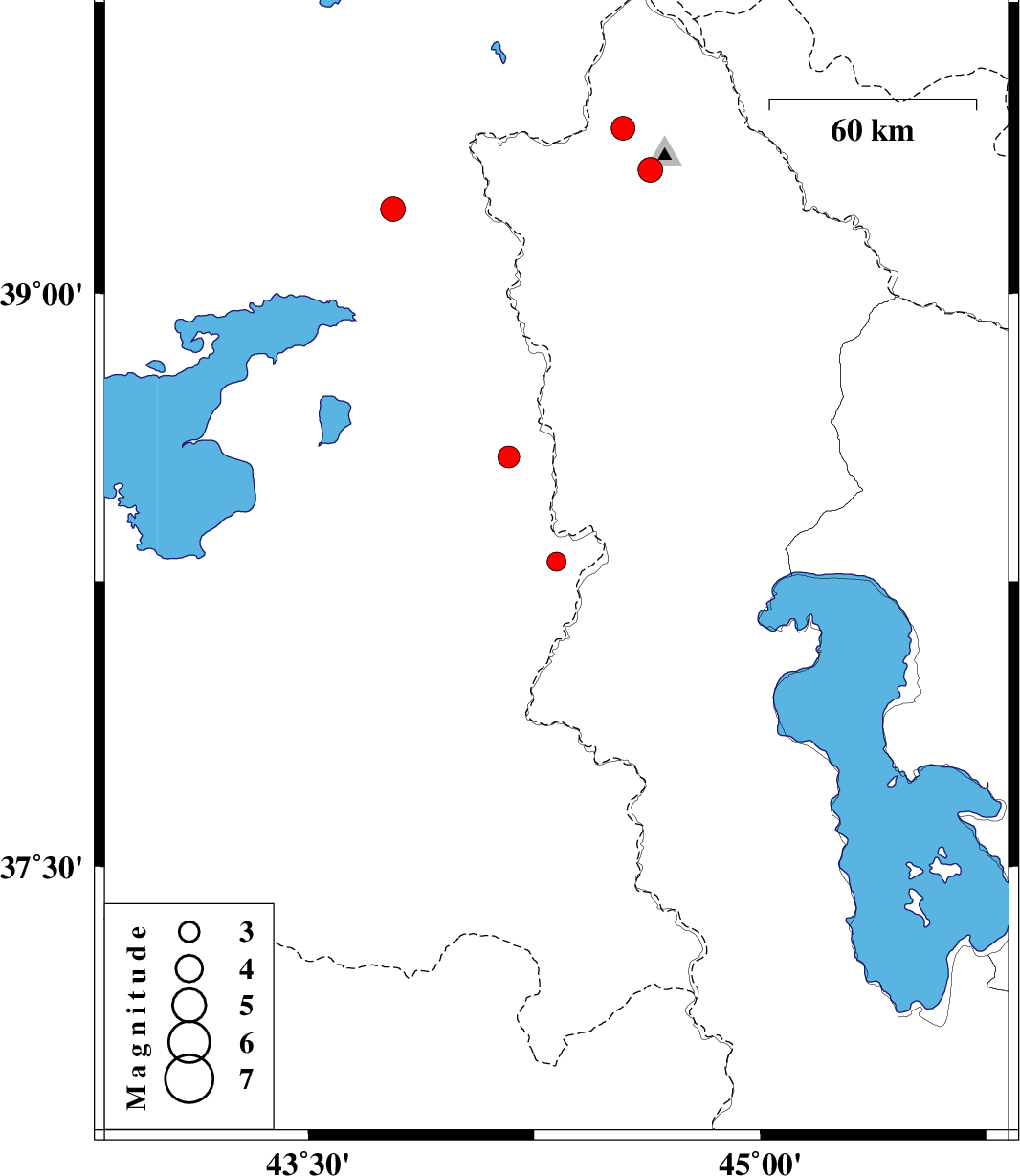 | 2023/04/17 | 04:07:18.9 | 07:37:18.9 | 39.217 | 43.781 | 12 | ML:3.7 | Turkey, 57 km North-West of Seyah Cheshmah |