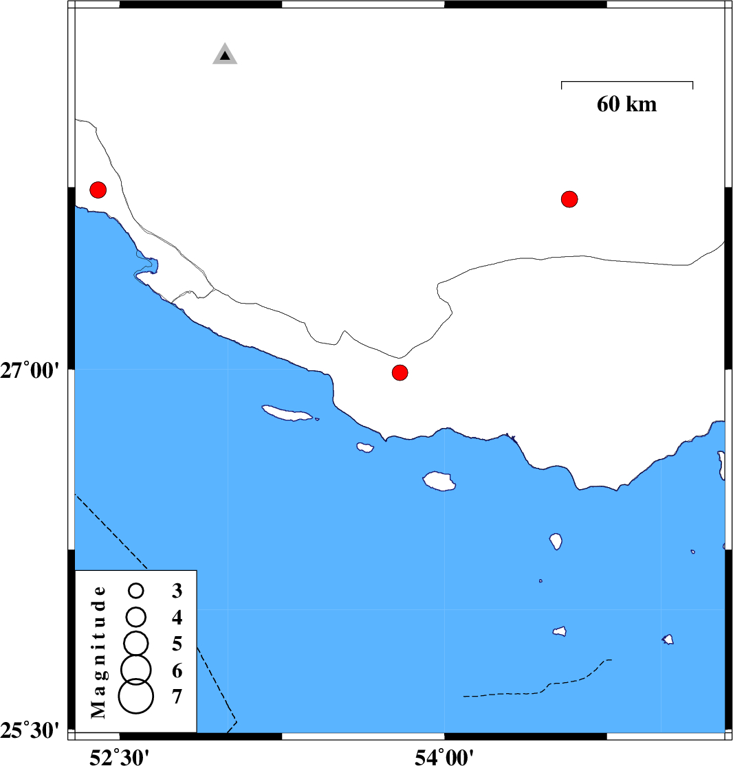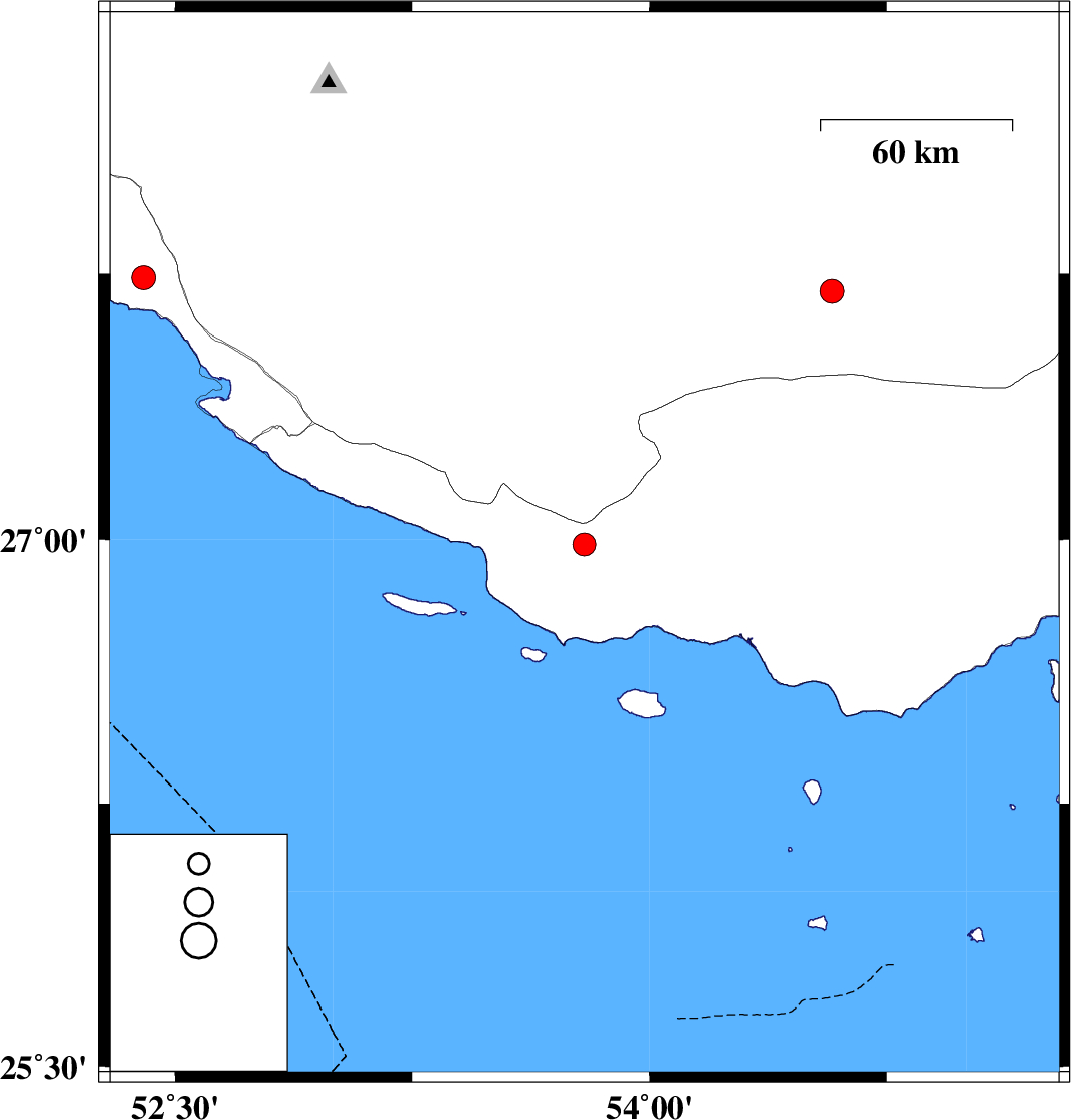 | 2023/04/24 | 14:12:23.1 | 17:42:23.1 | 26.985 | 53.794 | 12 | ML:3.2 | Hormozgan Province, 61 km South-West of Bastak | ||