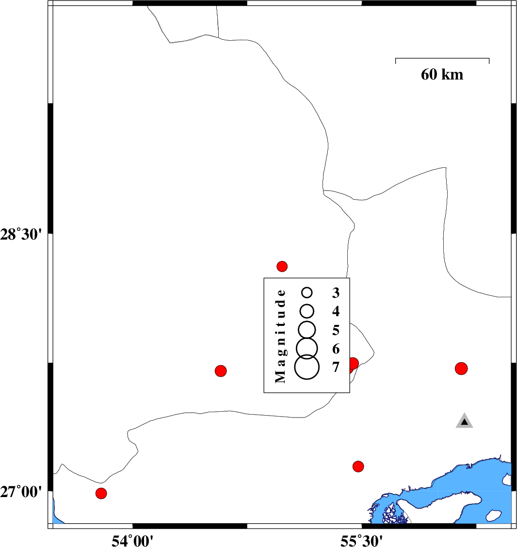 | 2023/04/27 | 10:20:48.8 | 13:50:48.8 | 27.726 | 55.396 | 10 | ML:4.6 | Fars Province, 82 km South-West of Hajiabad | ||