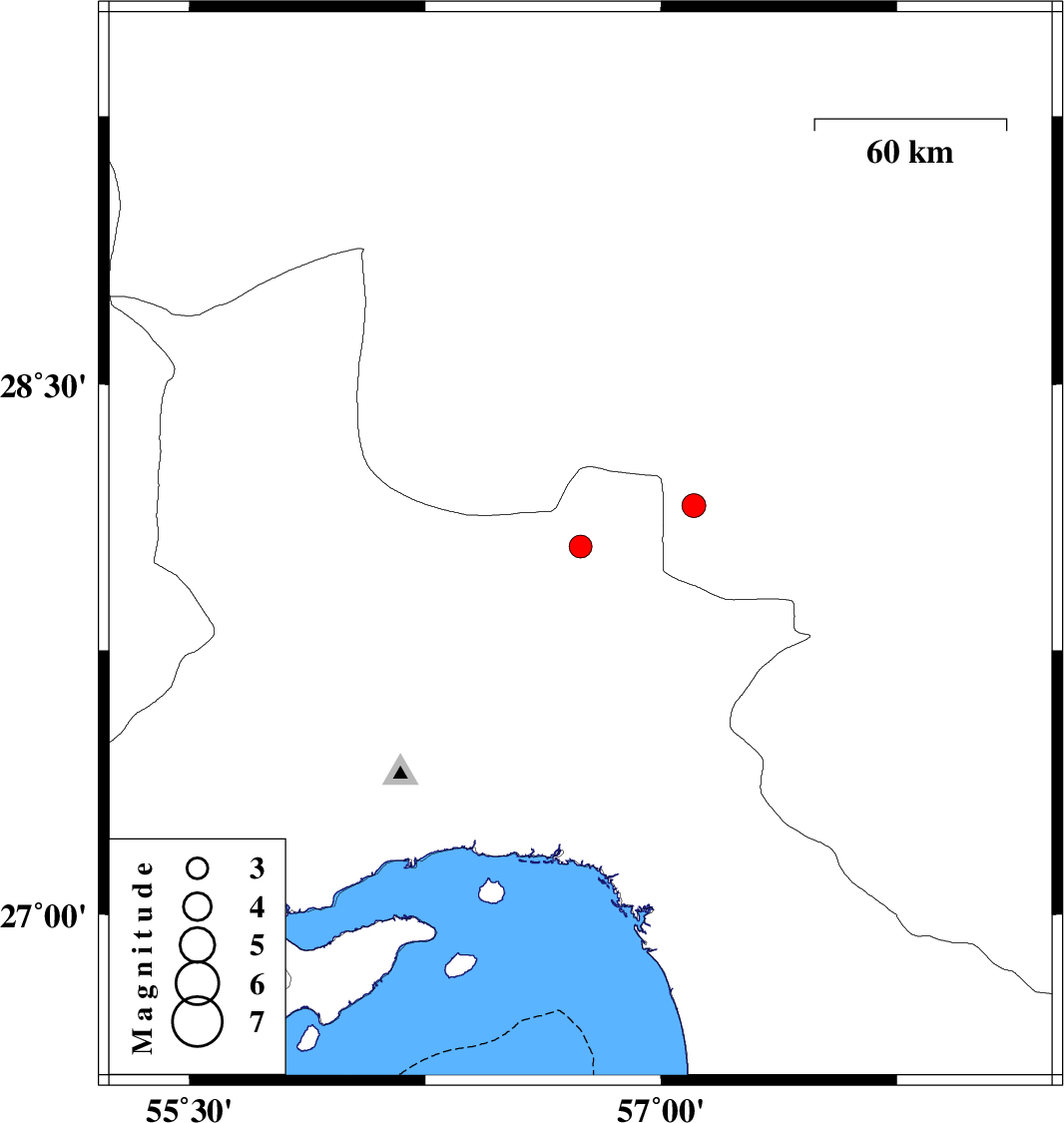 | 2023/05/14 | 12:36:29.4 | 16:06:29.4 | 28.159 | 57.105 | 12 | ML:3.4 | Kerman Province, 62 km North-West of Kahnuj | ||