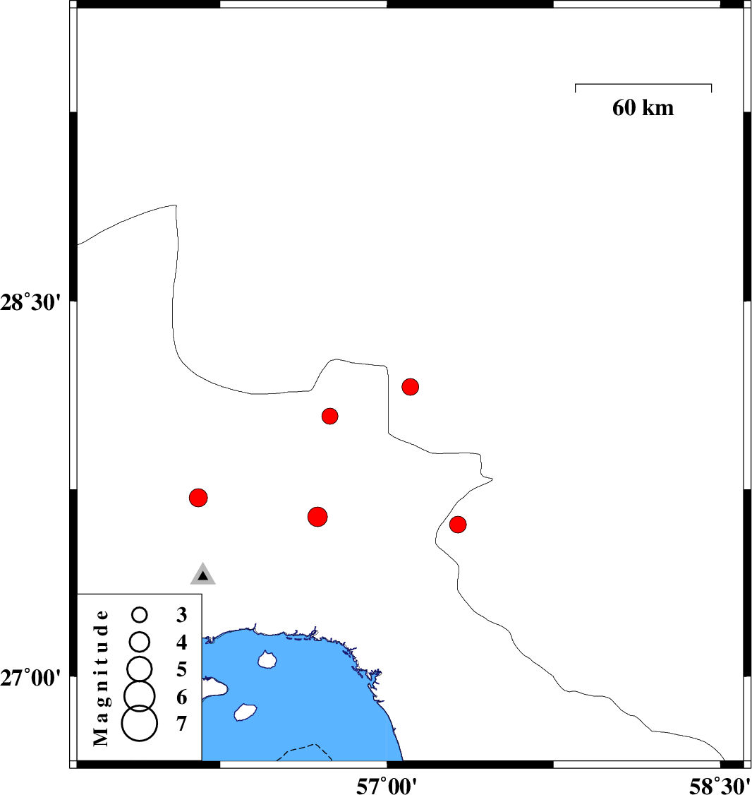 | 2023/05/14 | 12:36:29.4 | 16:06:29.4 | 28.159 | 57.105 | 12 | ML:3.4 | Kerman Province, 62 km North-West of Kahnuj | ||