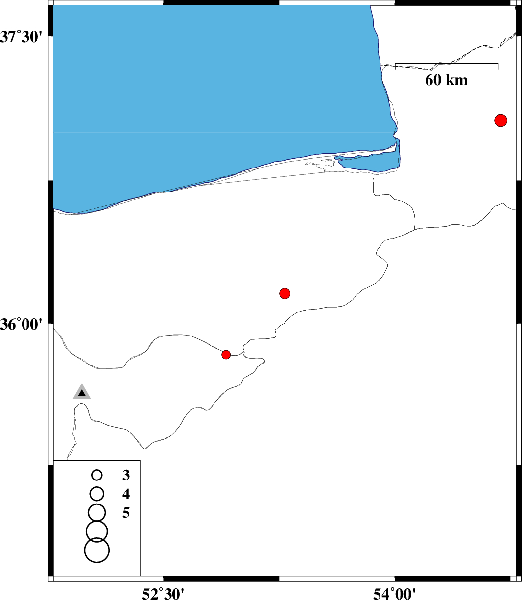 | 2023/05/16 | 00:41:04.1 | 04:11:04.1 | 36.158 | 53.287 | 9 | ML:3.1 | Mazandaran Province, 21 km -East of Pol-E-Sefid | ||