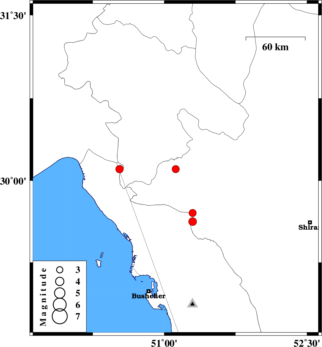 | 2023/06/05 | 09:58:49.5 | 13:28:49.5 | 29.625 | 51.299 | 16 | ML:3.8 | Fars Province, 34 km -West of Kazerun |