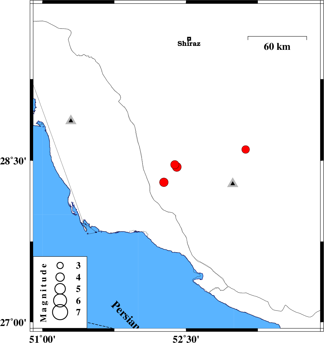| 2023/06/15 | 17:30:02.2 | 21:00:02.2 | 28.462 | 52.382 | 10 | ML:4 | Fars Province, 46 km South-West of Firuz Abad | ||