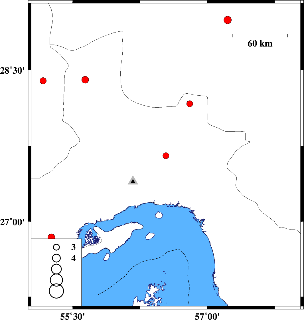 | 2023/05/19 | 21:08:49.2 | 00:38:49.2 | 26.843 | 55.263 | 12 | ML:3.5 | Hormozgan Province, 54 km North-East of Bandar-e lengeh | ||