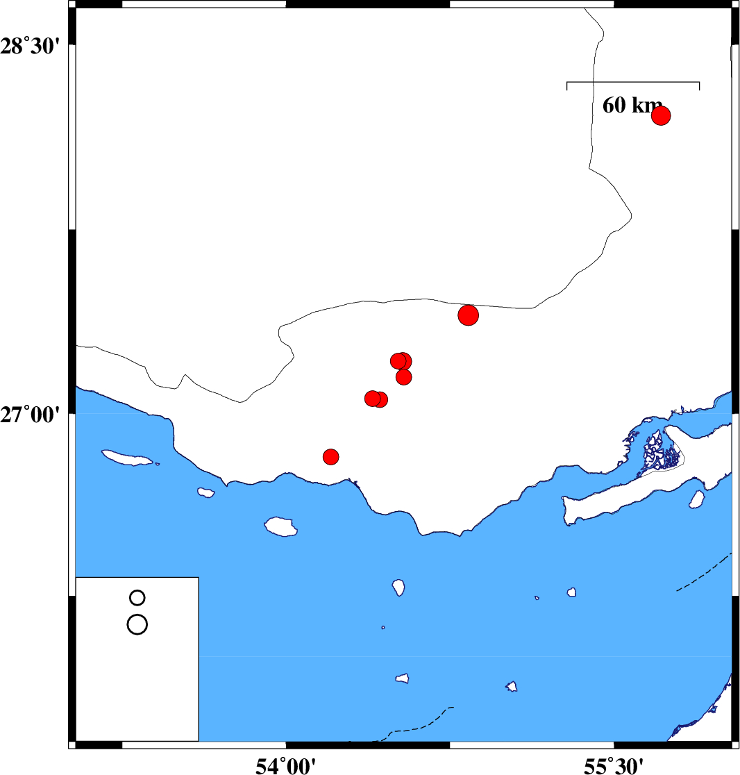 | 2023/06/26 | 07:39:10.2 | 11:09:10.2 | 27.214 | 54.512 | 20 | ML:3.2 | Hormozgan Province, 15 km -East of Bastak | ||