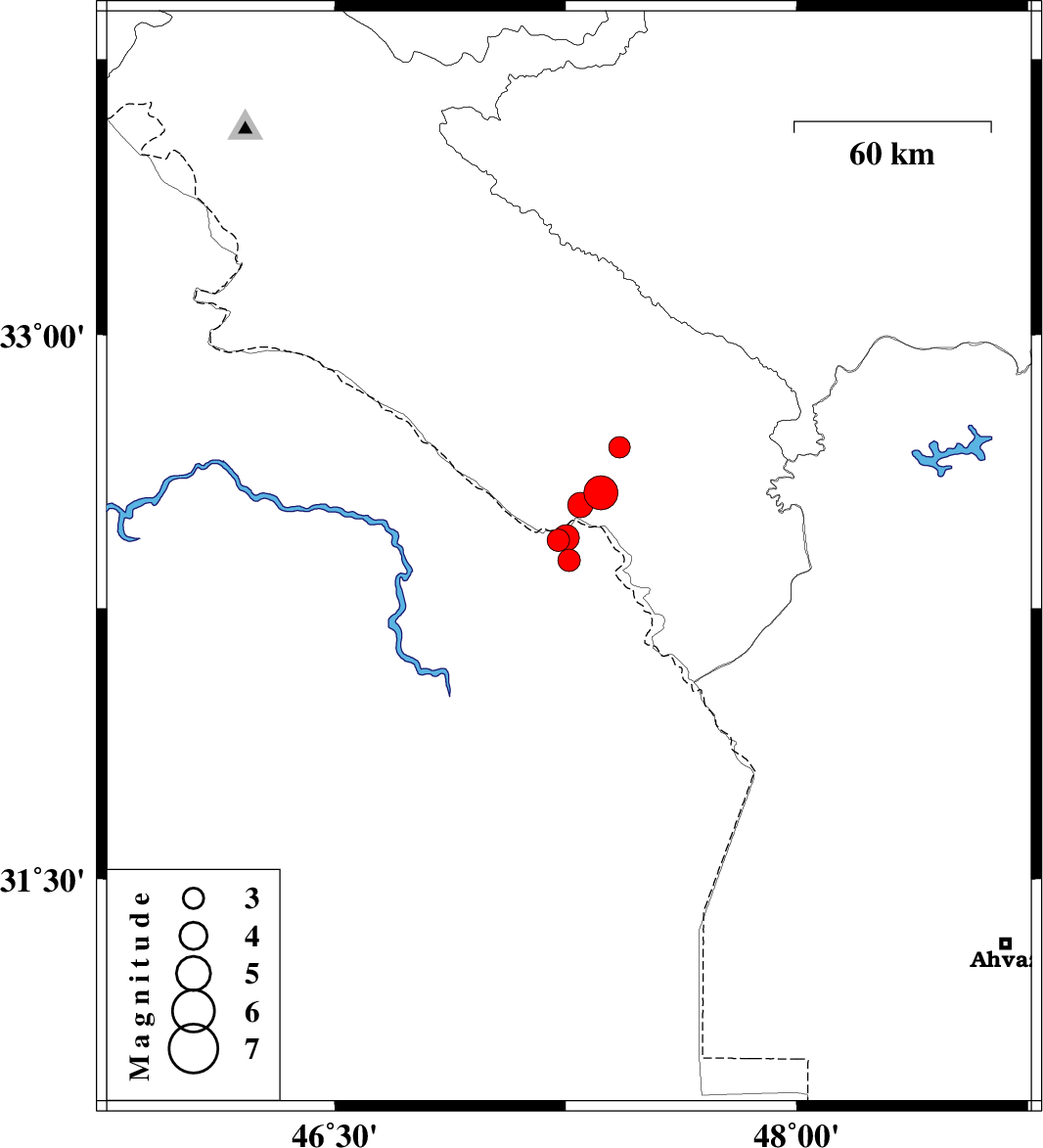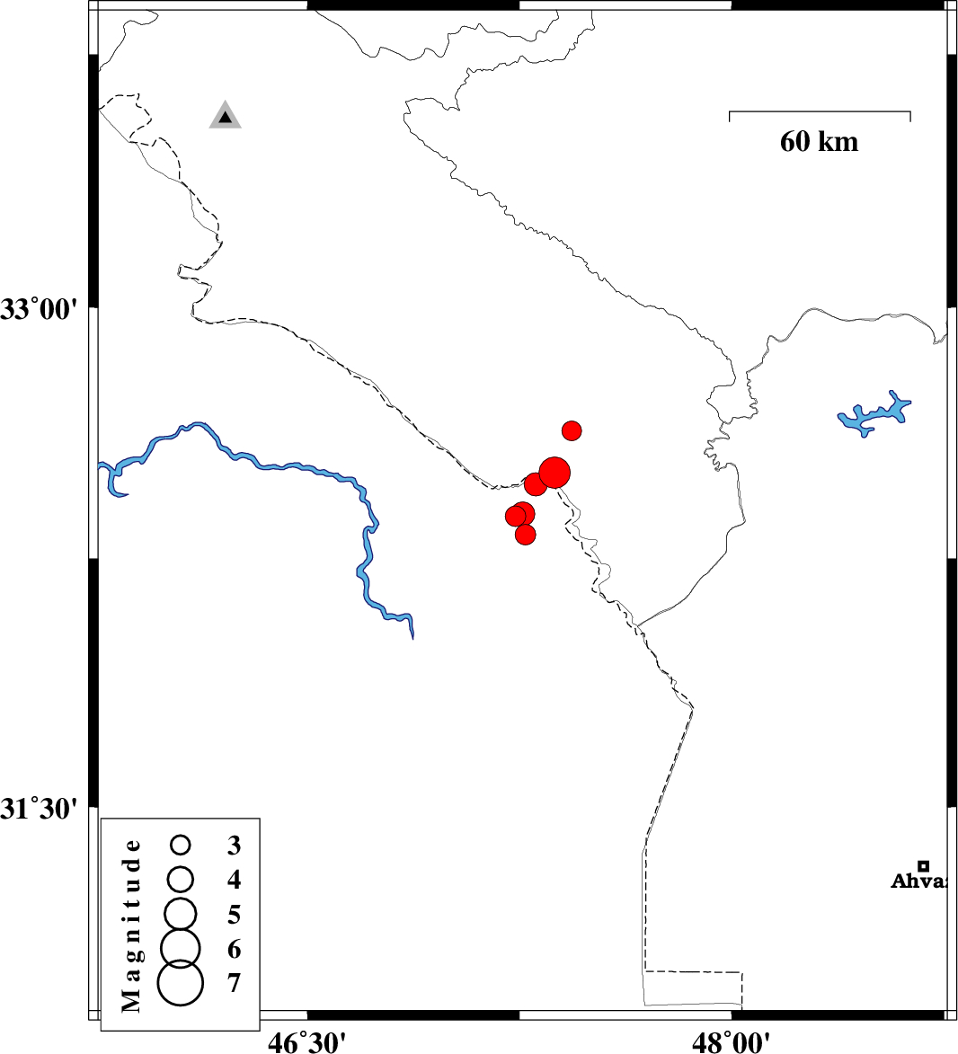 | 2023/06/28 | 19:23:01.6 | 22:53:01.6 | 32.382 | 47.261 | 12 | ML:3.3 | Iraq, 35 km South of Dehloran | ||