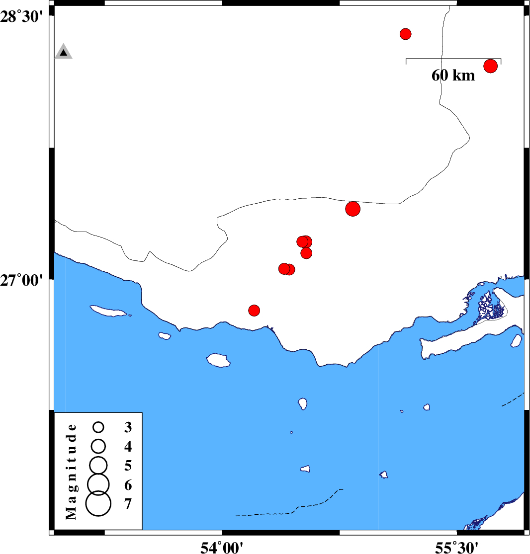 2023/06/26 07:39:10.2 11:09:10.2 27.21454.51220 ML:3.2 Hormozgan Province, 15 km -East of Bastak
