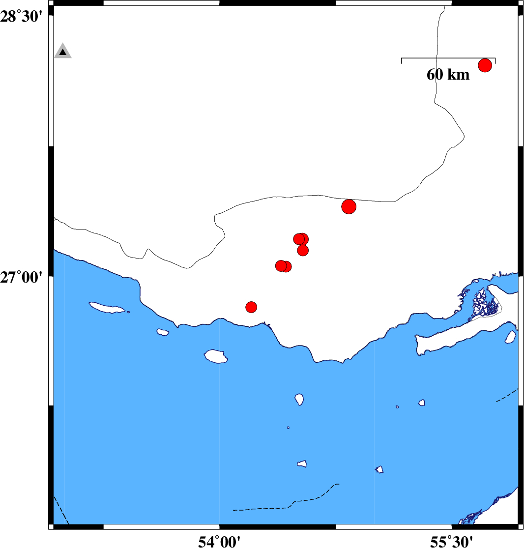 | 2023/06/26 | 07:39:10.2 | 11:09:10.2 | 27.214 | 54.512 | 20 | ML:3.2 | Hormozgan Province, 15 km -East of Bastak | ||
