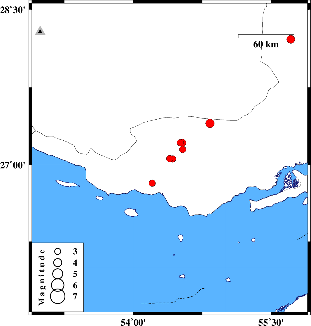 | 2023/06/26 | 07:39:10.2 | 11:09:10.2 | 27.214 | 54.512 | 20 | ML:3.2 | Hormozgan Province, 15 km -East of Bastak | ||