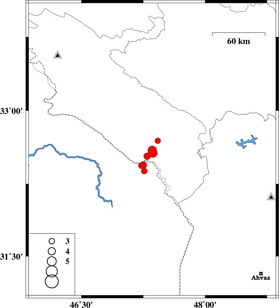 | 2023/06/28 | 19:23:01.6 | 22:53:01.6 | 32.382 | 47.261 | 12 | ML:3.3 | Iraq, 35 km South of Dehloran | ||