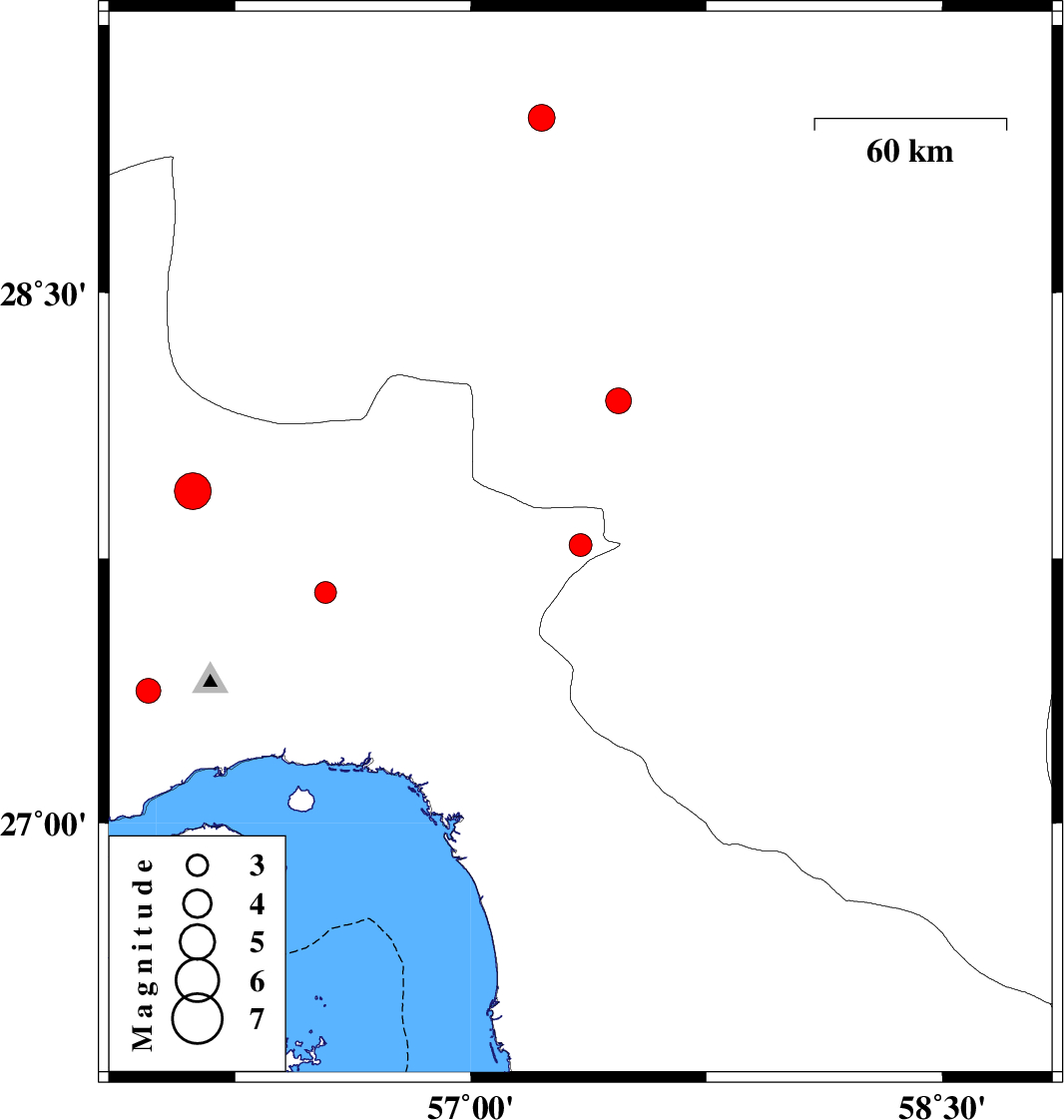 | 2023/07/06 | 15:09:53.8 | 18:39:53.8 | 27.789 | 57.349 | 12 | ML:3.2 | Hormozgan Province, 42 km North-East of Dehbarez | ||