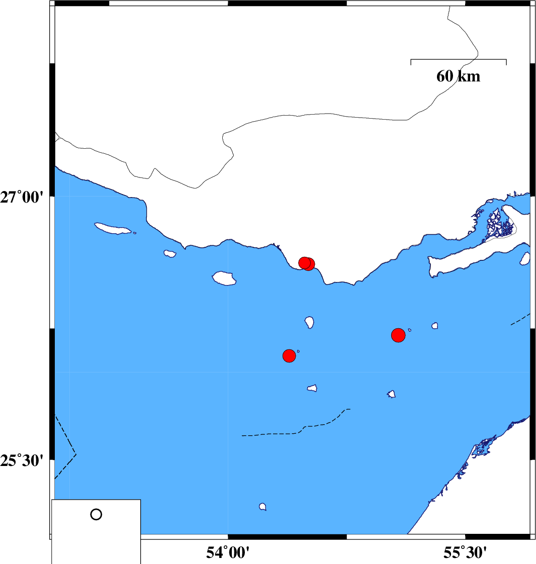 | 2023/07/04 | 02:20:08.4 | 05:50:08.4 | 27.093 | 54.528 | 12 | ML:3.6 | Hormozgan Province, 20 km South-East of Bastak | ||