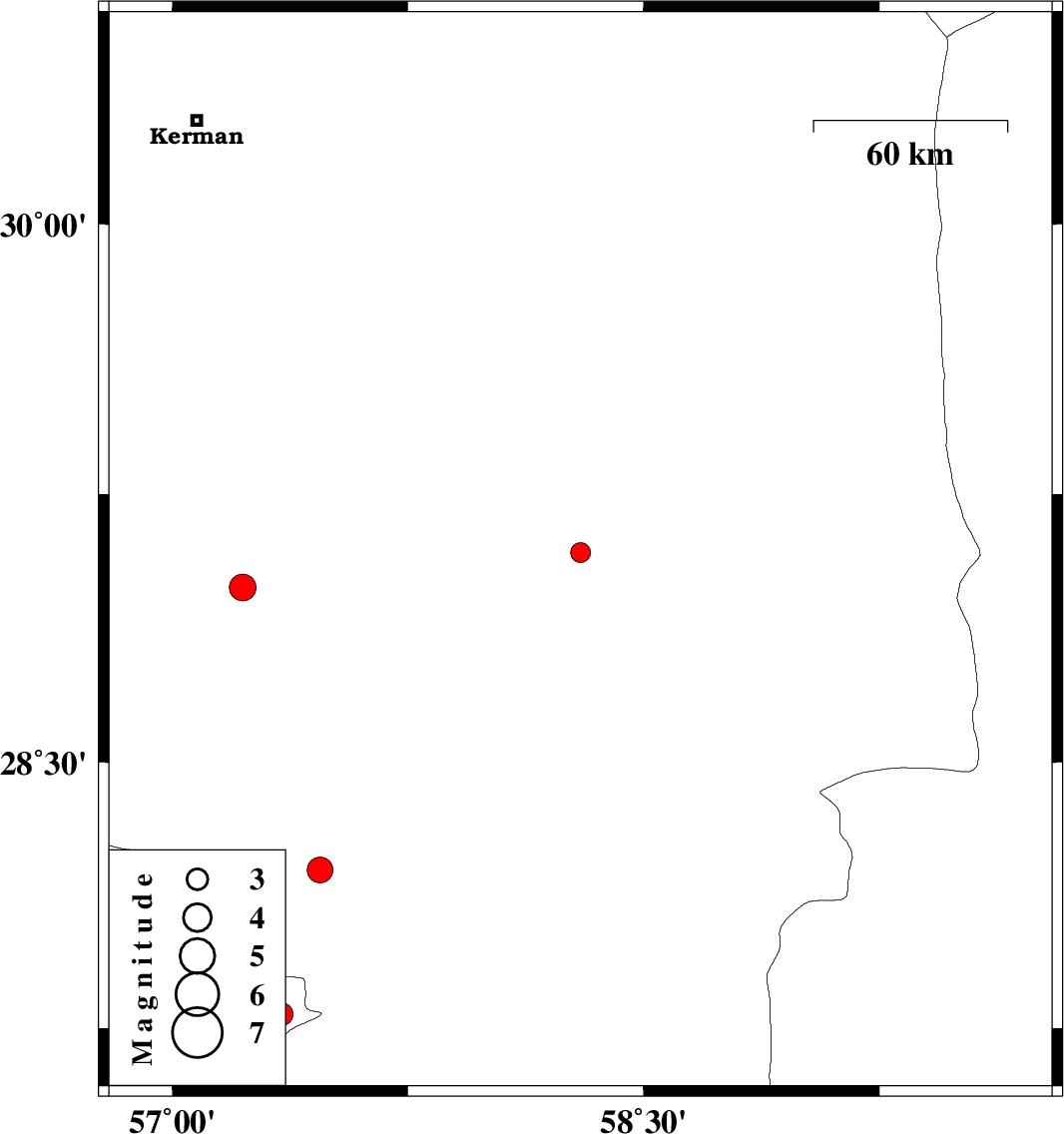 | 2023/06/23 | 05:17:10.8 | 08:47:10.8 | 28.196 | 57.47 | 10 | ML:3.6 | Kerman Province, 35 km North-West of Kahnuj | ||