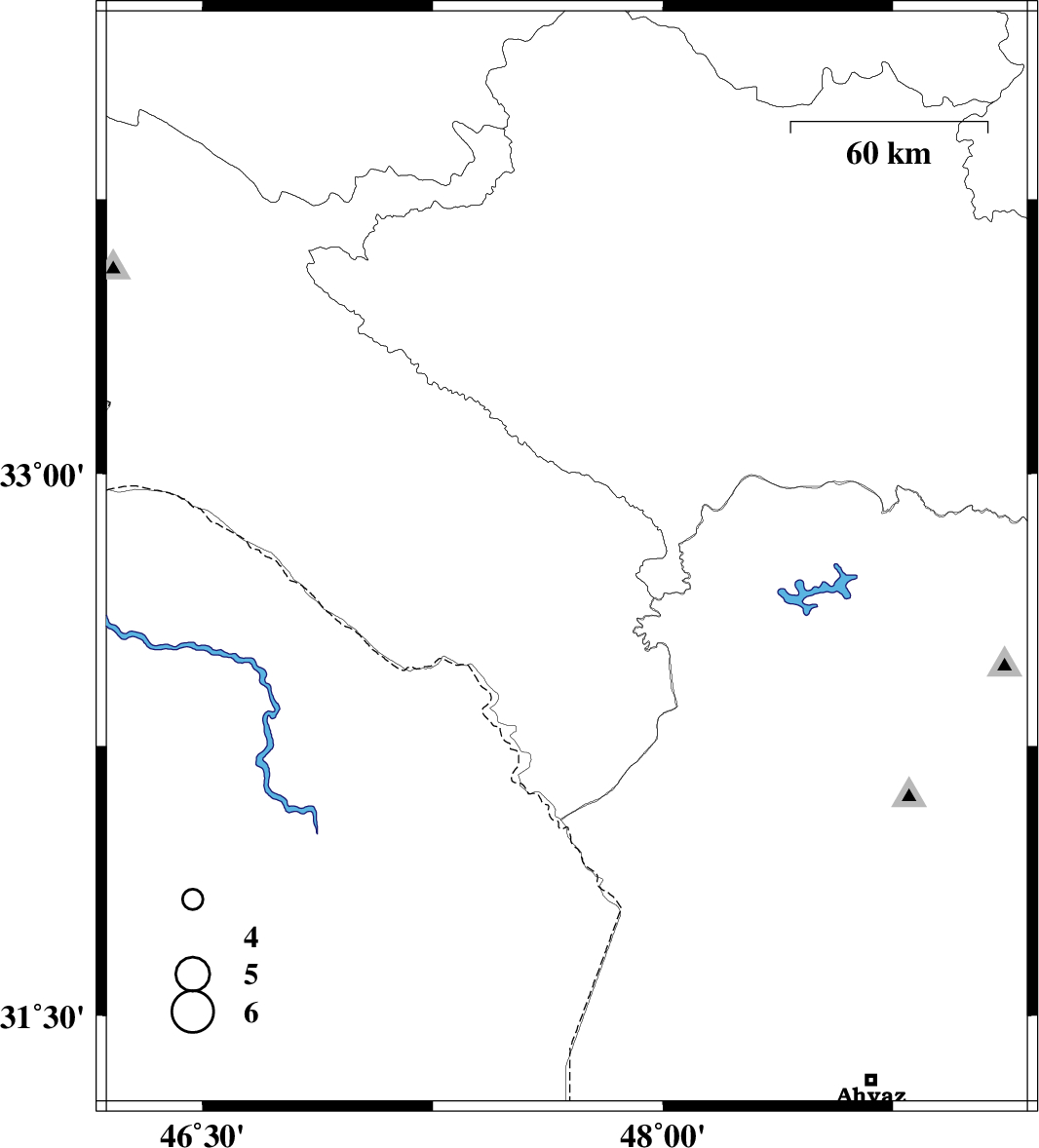 | 2023/06/28 | 19:23:01.6 | 22:53:01.6 | 32.382 | 47.261 | 12 | ML:3.3 | Iraq, 35 km South of Dehloran | ||